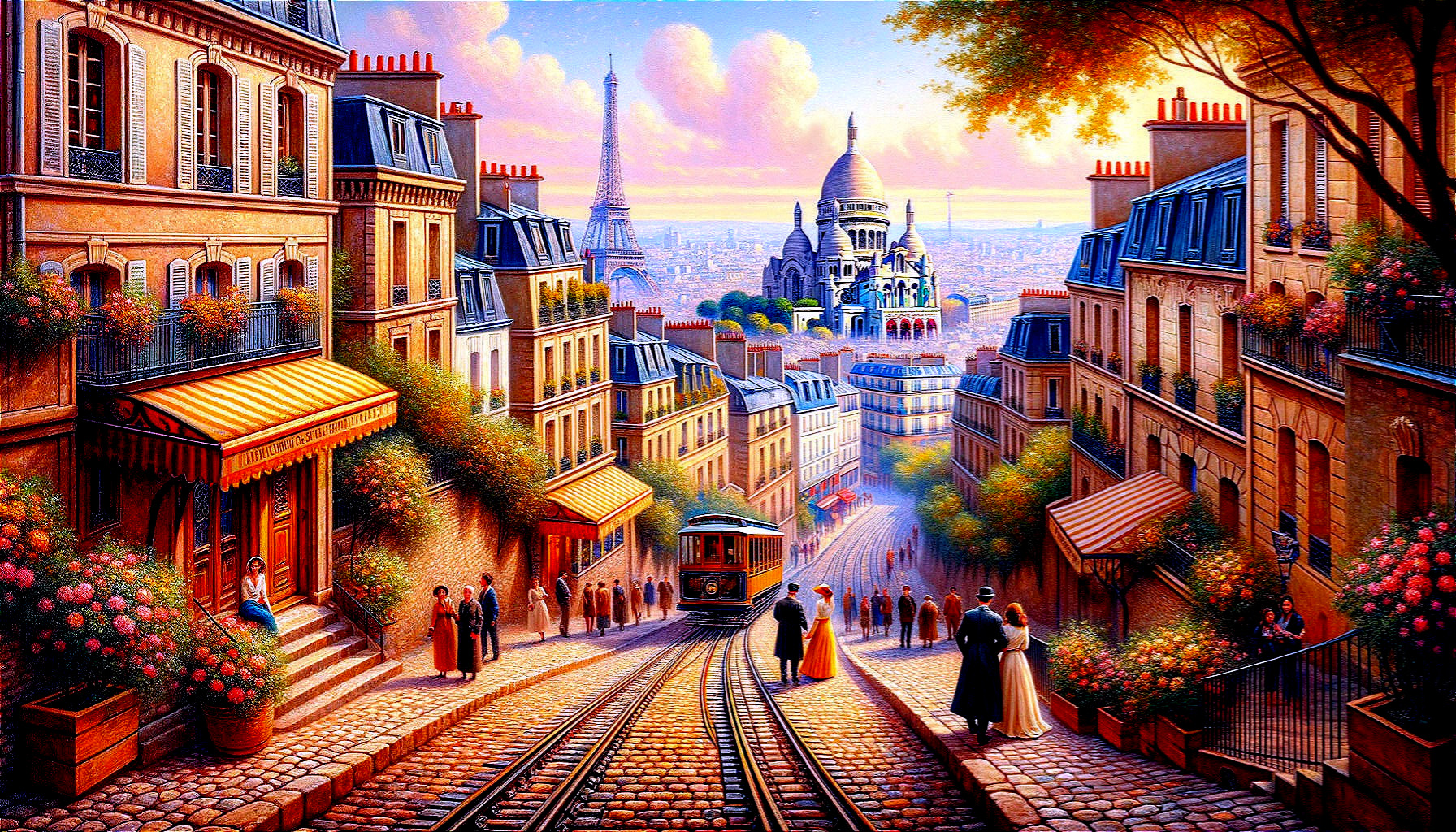 Experience a stunning digital painting capturing the essence of Montmartre's iconic railway ascent in Paris. Detailed architecture, romantic atmosphere, and whimsical touches bring this nostalgic scene to life in high-resolution, award-winning quality.