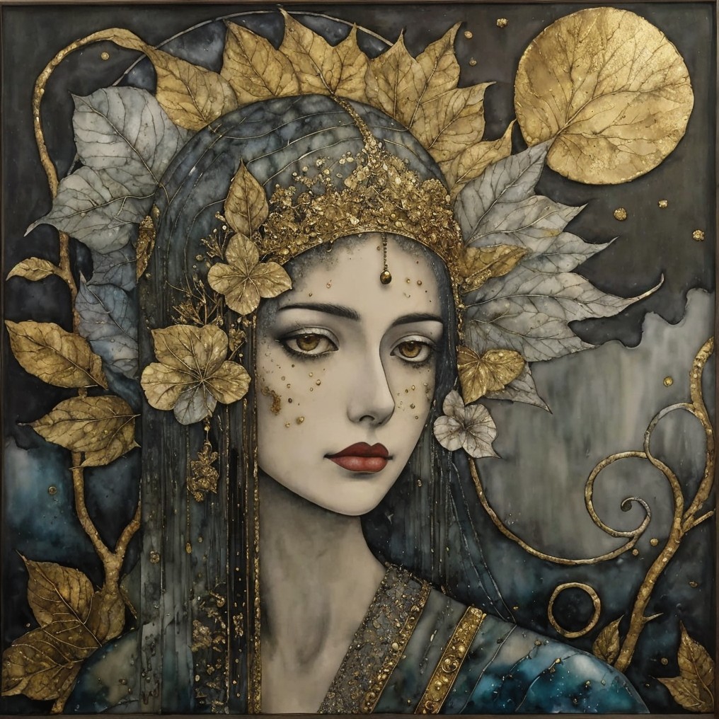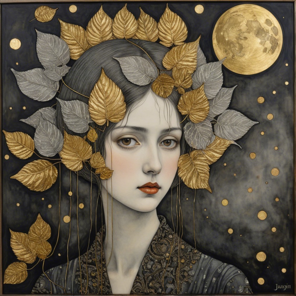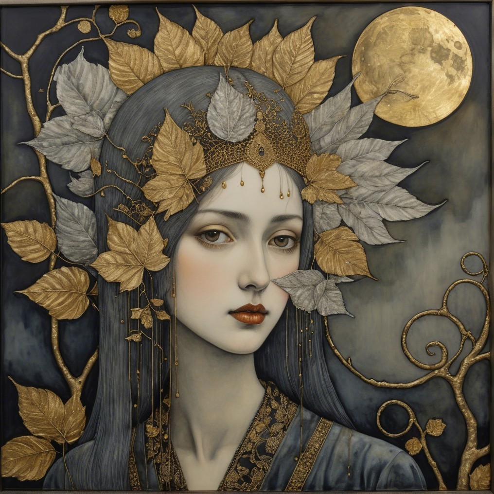 The artwork features a serene woman surrounded by delicate golden leaves and intricate patterns, set against a dark background with a glowing moon, exuding a mystical, ethereal quality.