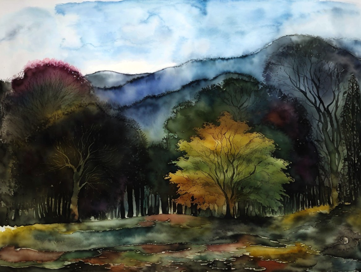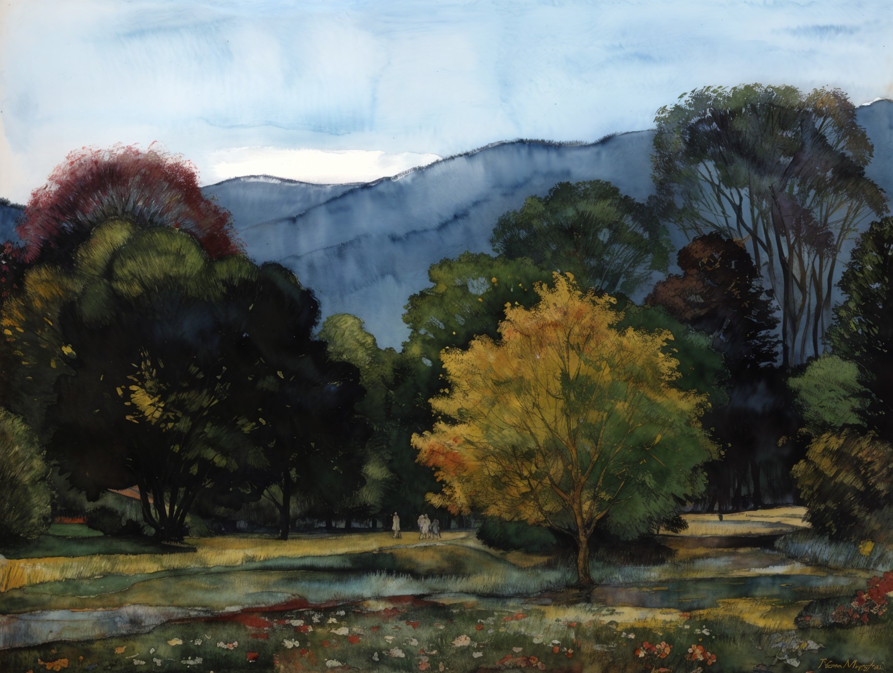 A serene watercolor scene depicts quaint houses surrounded by trees. Two figures sit at a table, while vibrant flowers bloom in a lush garden, set against a backdrop of mountains and soft clouds.