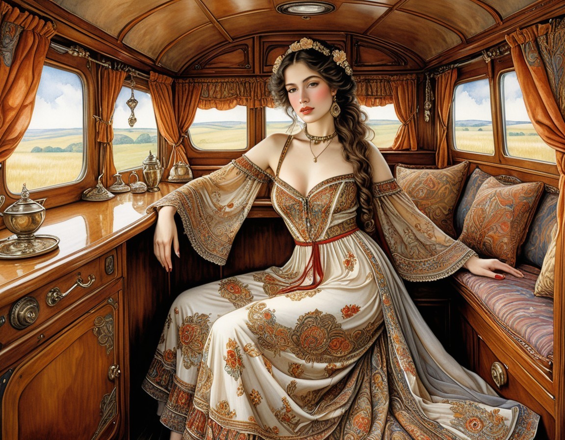 A elegantly dressed woman in a flowing gown sits in a lavishly decorated interior of a vintage transport. Rich colors and intricate patterns accentuate the opulence of her surroundings.