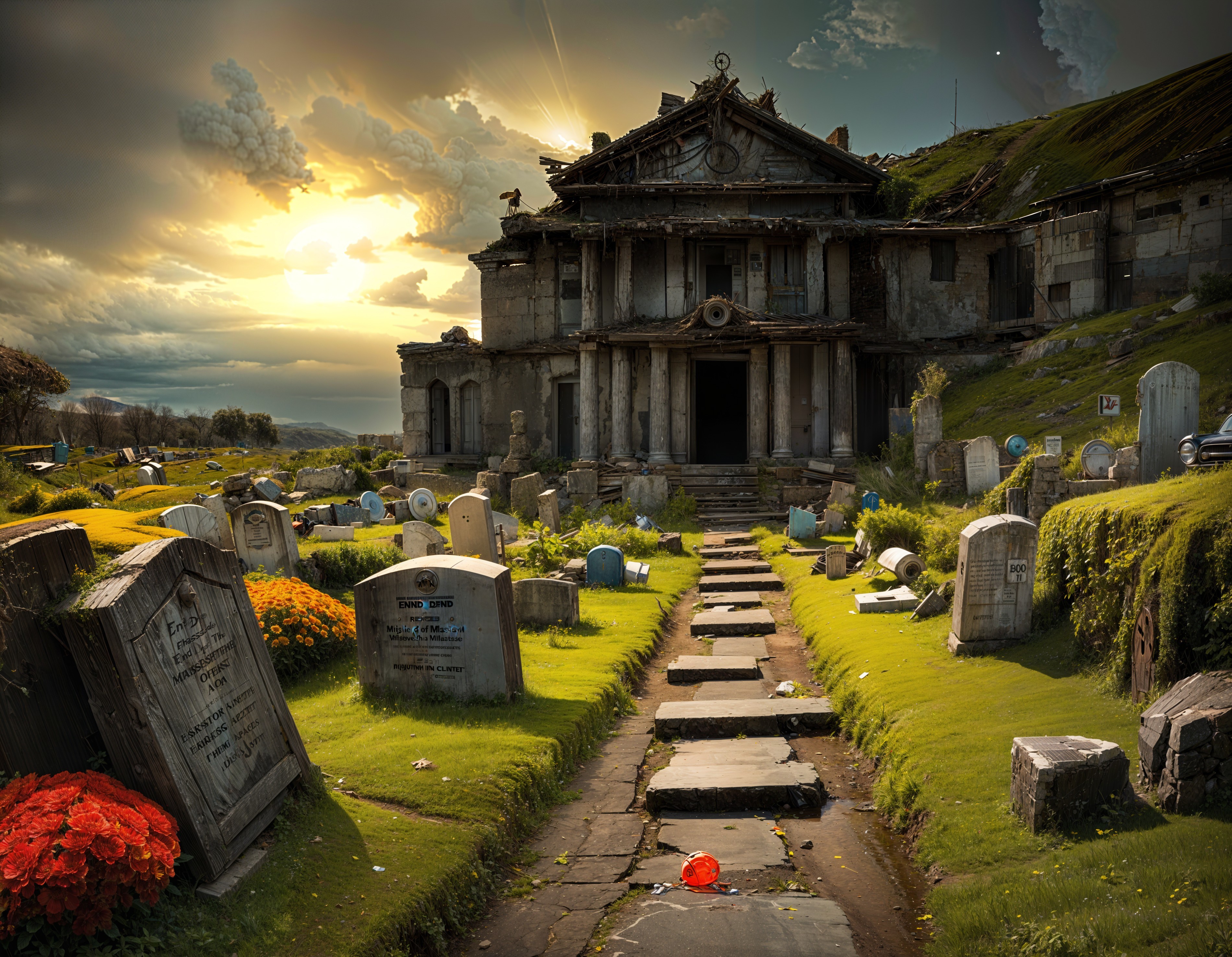 Serene Cemetery with Mossy Pathway and Mausoleum