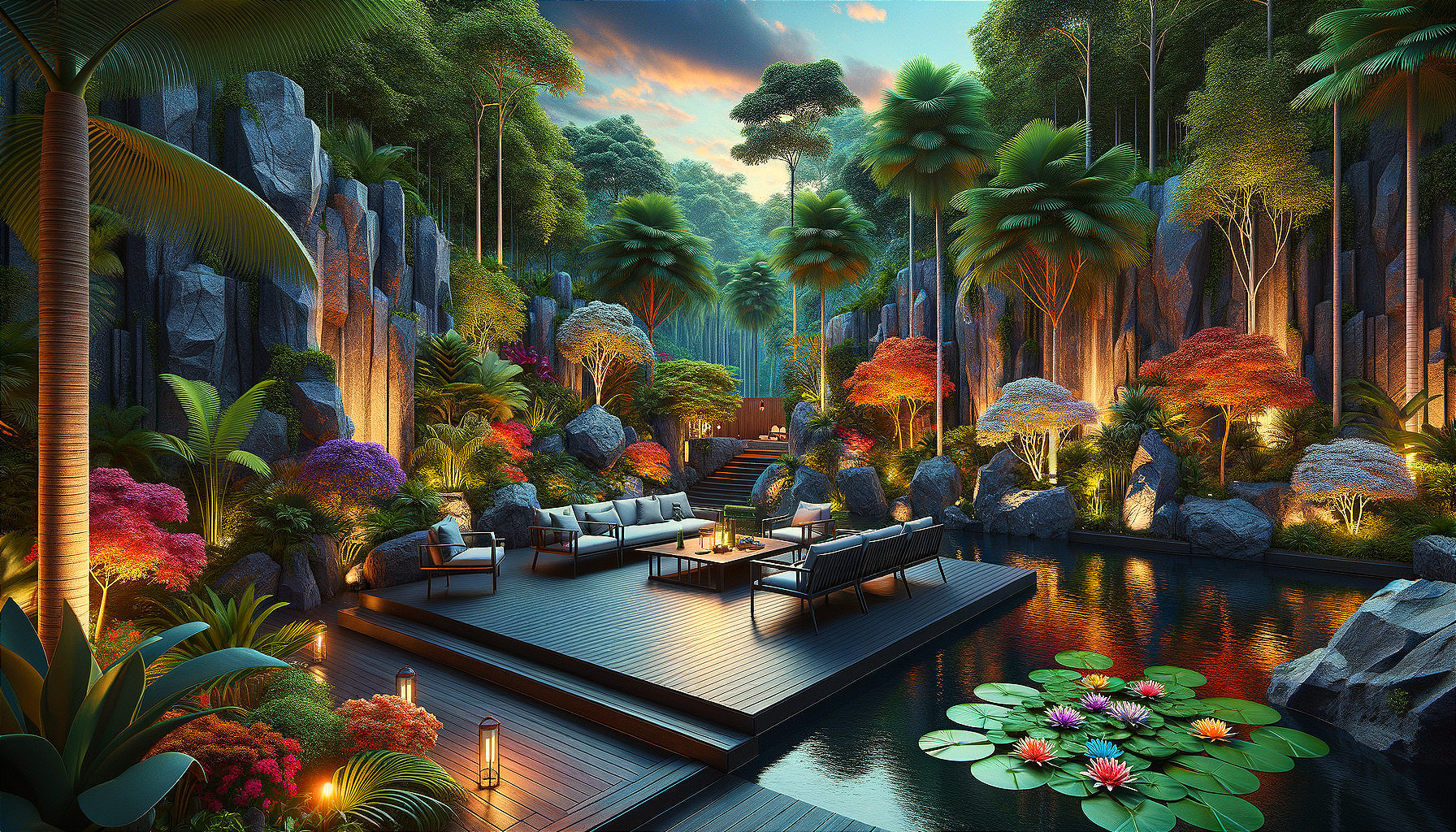 A breathtaking photo of a nature-inspired outdoor oasis featuring a serene pond, lush greenery, vibrant flowers, and a cozy dining area on a wooden deck. The image captures intricate details and stunning colors, creating a captivating and award-winning visual experience.