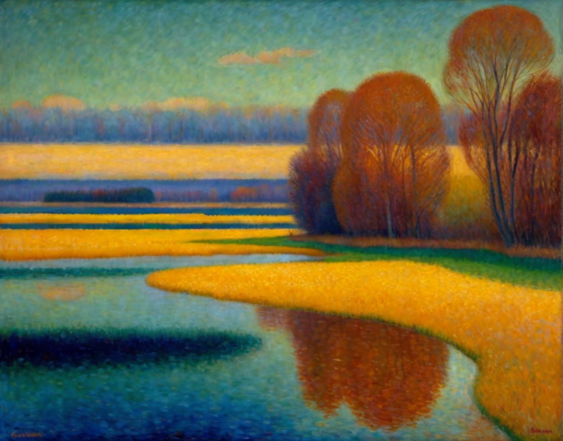 A painting of a serene wetland landscape featuring golden hues, reflective waters, and bright trees.