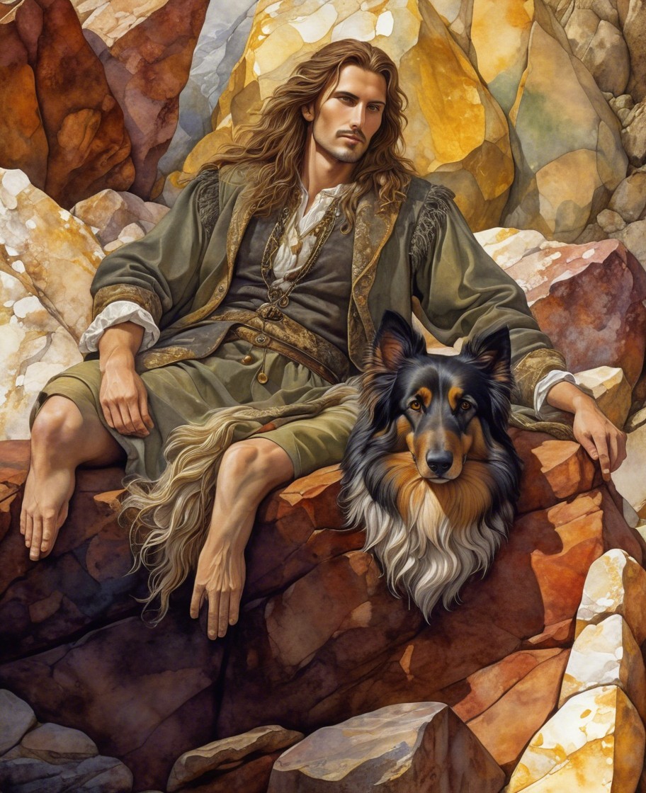 Portrait of splashes and blots of paint and ink of the long haired shepherd in the base image laying upon a rocky ledge, intricate openwork background, amber olive silver white, 3D, Shabby, Surreal fantasy, 3D Zentangle Style, Watercolor patchwork quilt, Arthur Rackham Style, Paul Kidby, Gediminas Prankevicius, Jacek Jerka, watercolor pen and ink by Yoshitaka Amano, extremely detailed, aesthetic, concept art, ultrafine detail, breathtaking, 8k resolution, vray tracing