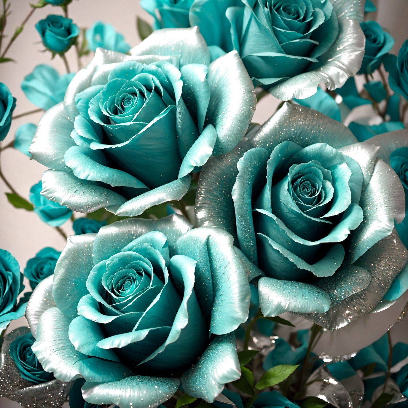 A bouquet of teal and white roses with delicate gold speckles, suggesting a unique and artistic floral arrangement.