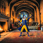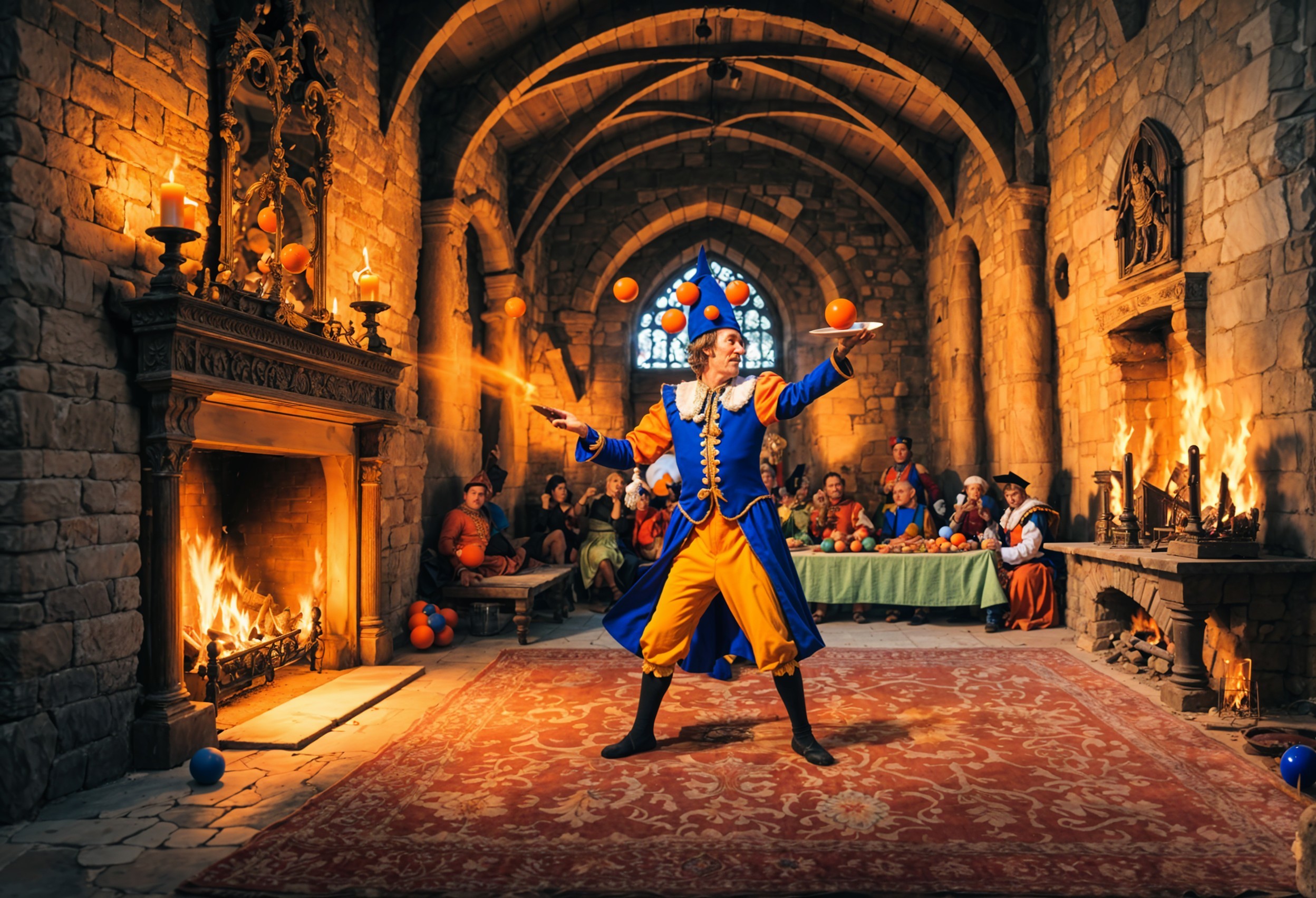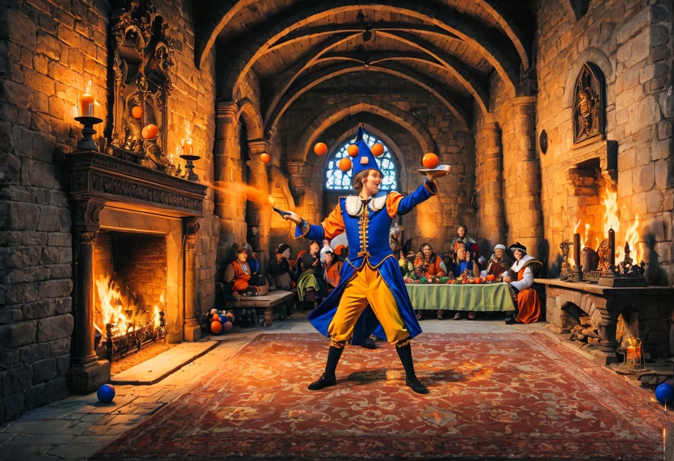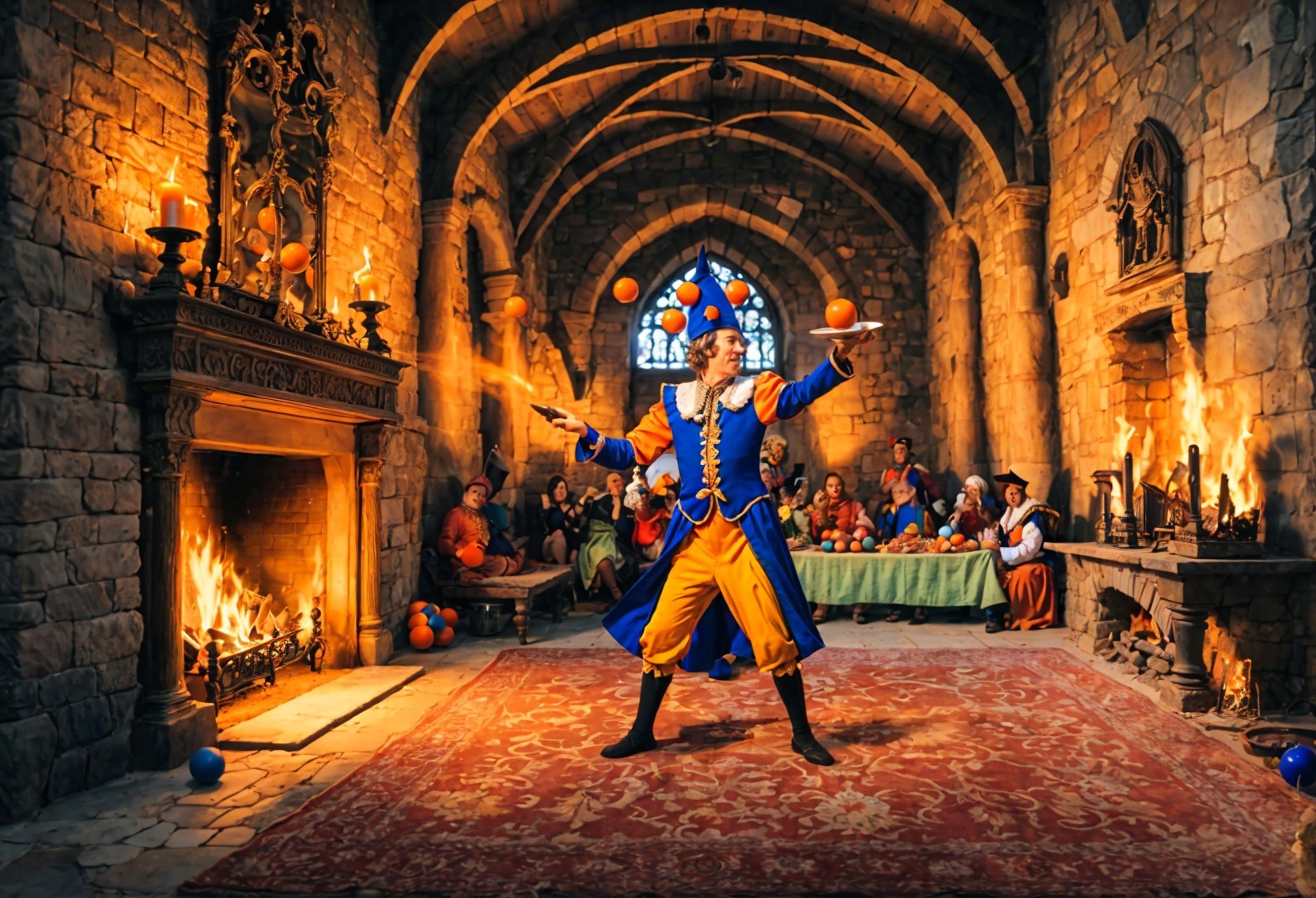 In a medieval-themed hall, a jester in vibrant attire juggles colorful balls. Spectators enjoy the performance near a roaring fireplace, surrounded by stone walls and medieval decor.