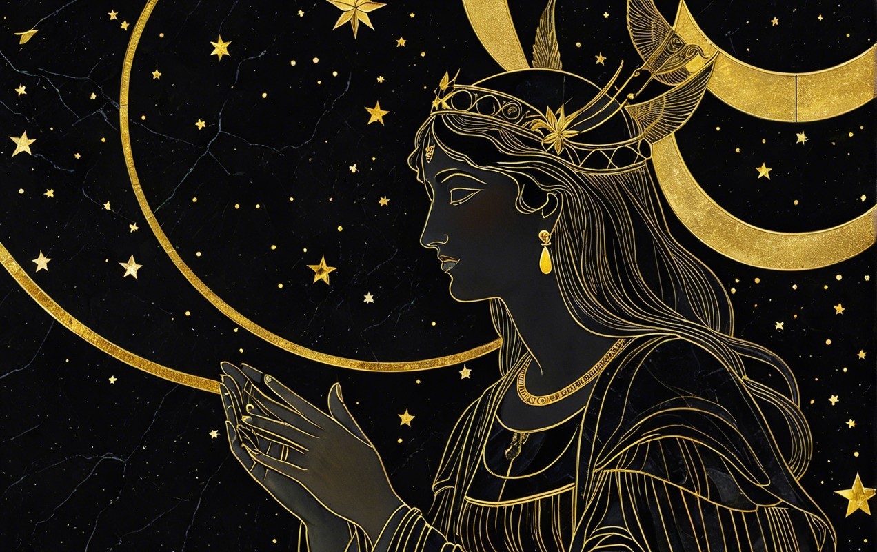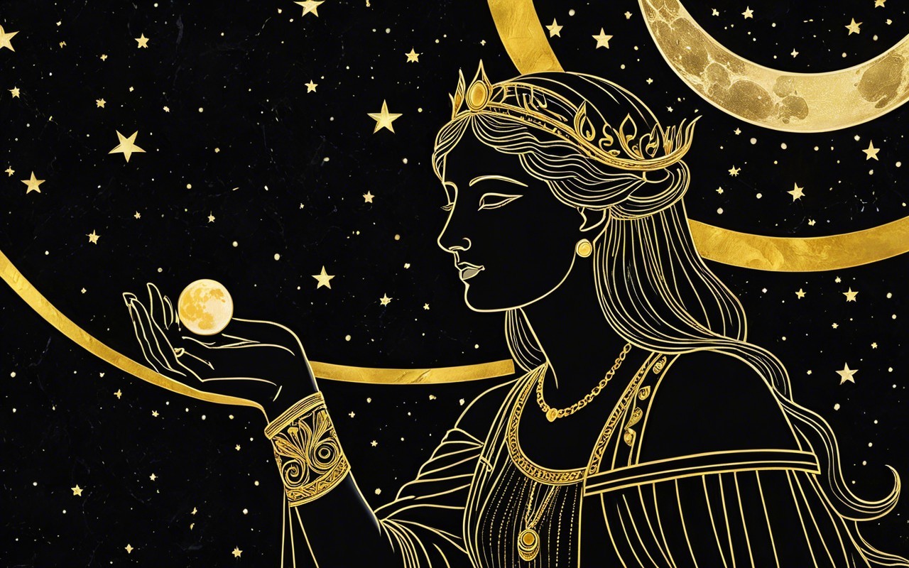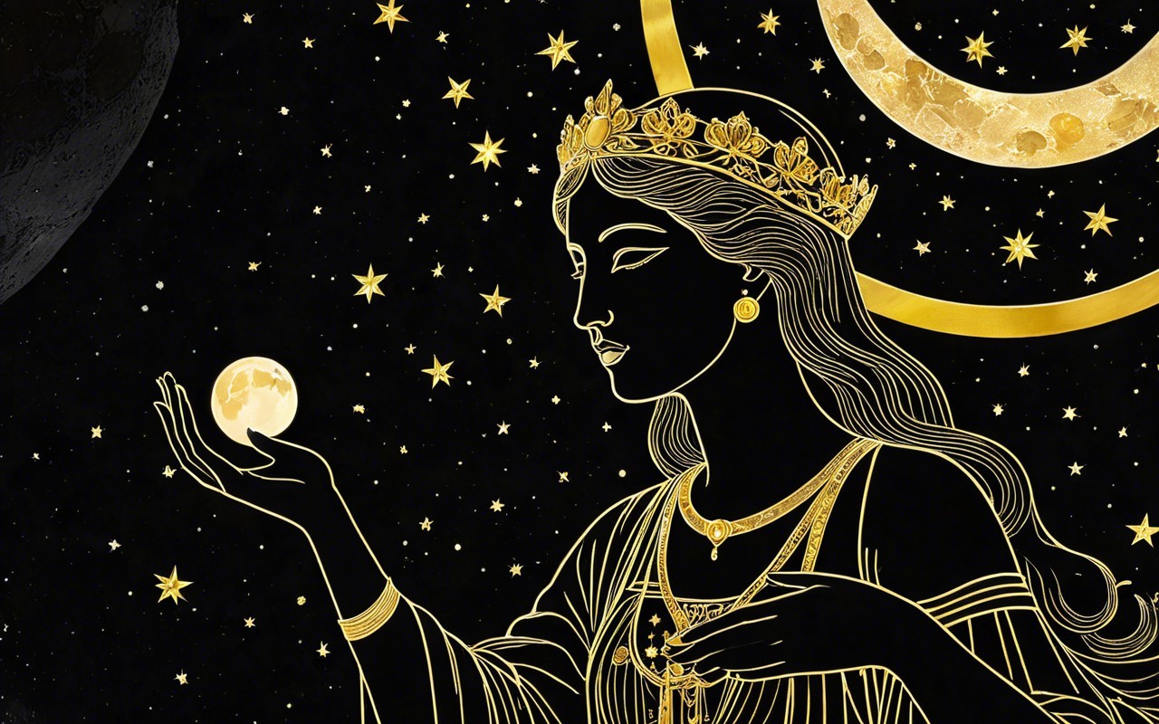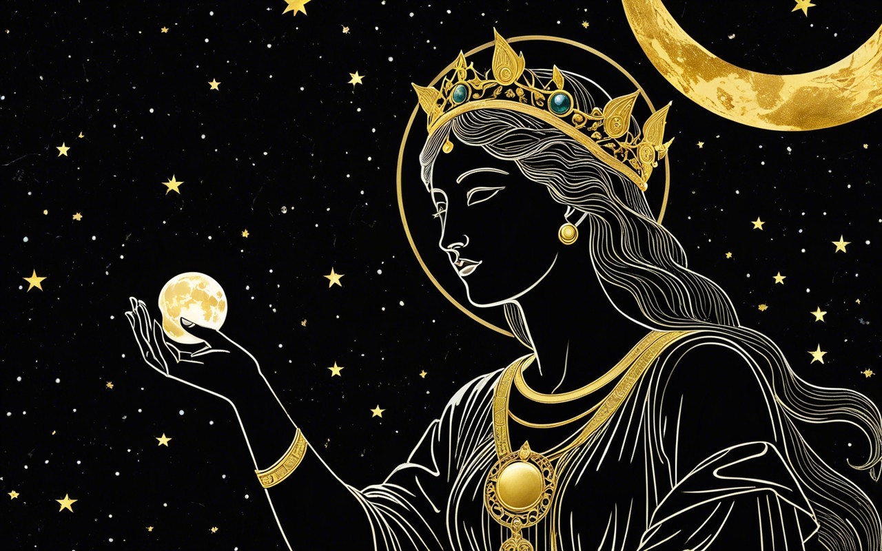 An illustrated woman adorned in regal attire with a moon and stars in the background.