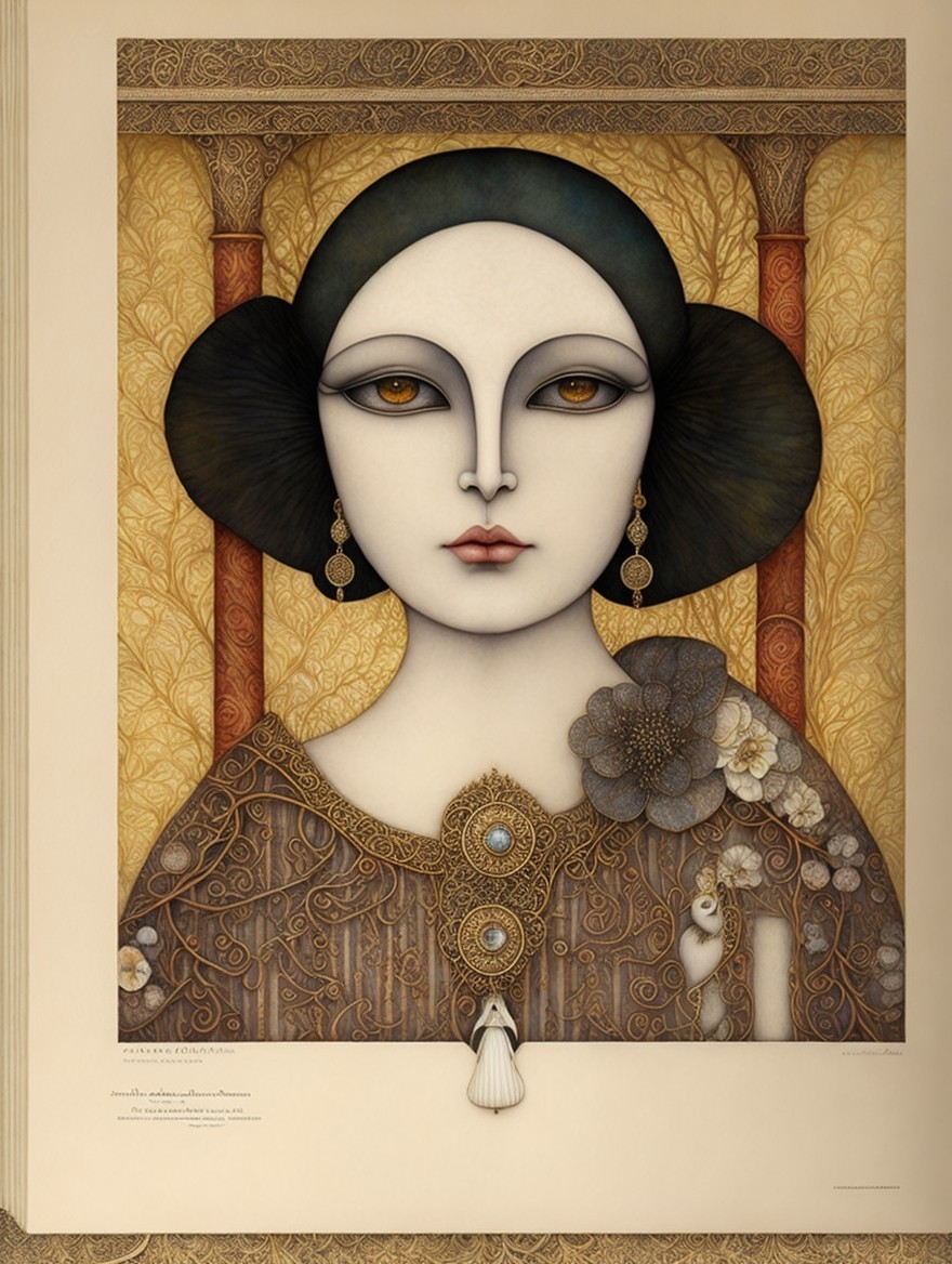The artwork features a stylized female face with striking almond-shaped eyes and intricate gold and floral designs around her, exuding an aura of mystique and elegance.