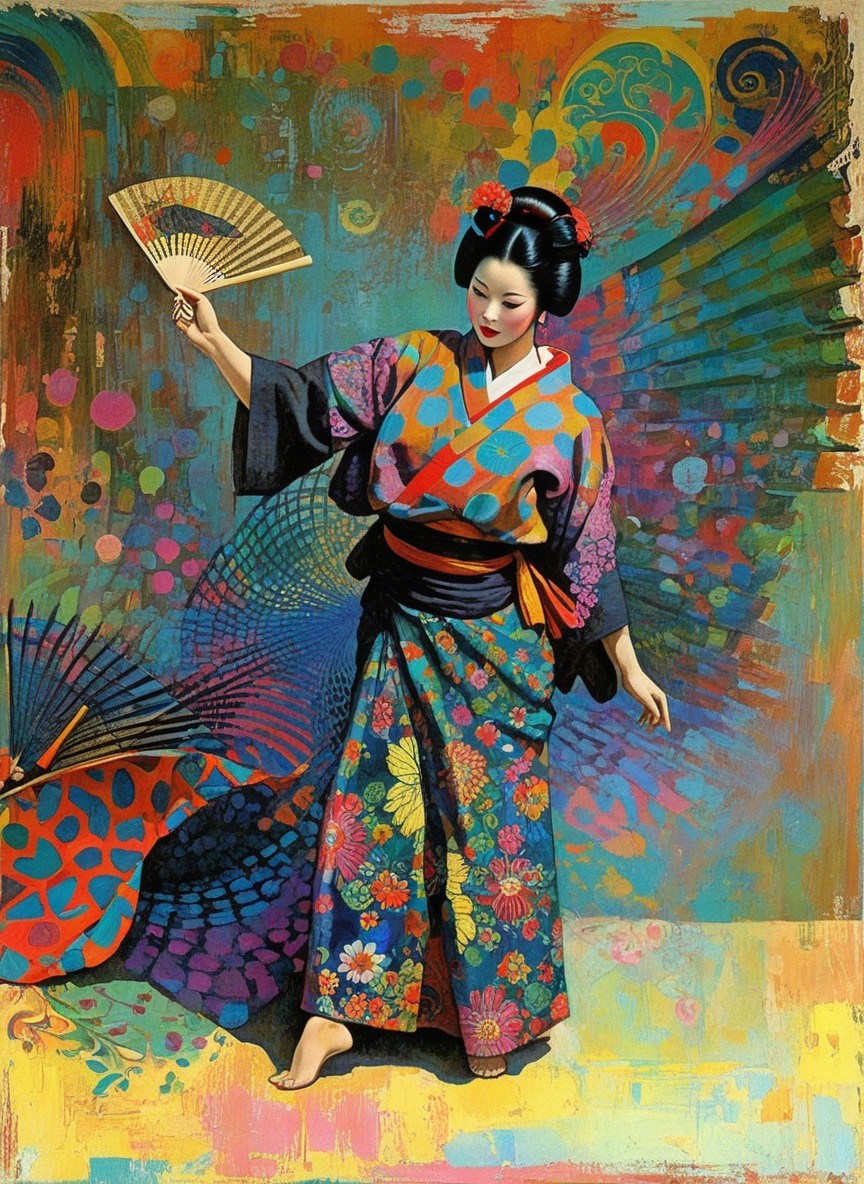 Dancing Geisha With a Fan in her hand, colourful, Style: creepy,  Zdzisław Beksiński, Picasso, naive art, Henri Matisse, Alex Grey, SALVADOR DALI, Andy Warhol, Paul Gauguin, Claude Monet, Gustav Klimt, Ernst, Ludwig Kirchner, Tim Burton, graffiti, zentangle, Marc Chagall, Jackson, Pollock, Francis Bacon, Egon Schiele, Georges Seurat M.C. Escher Joan Miró, art brut, Odilon Redon, Remedios Varo, primitivism, abstract expressionism , psychedelic