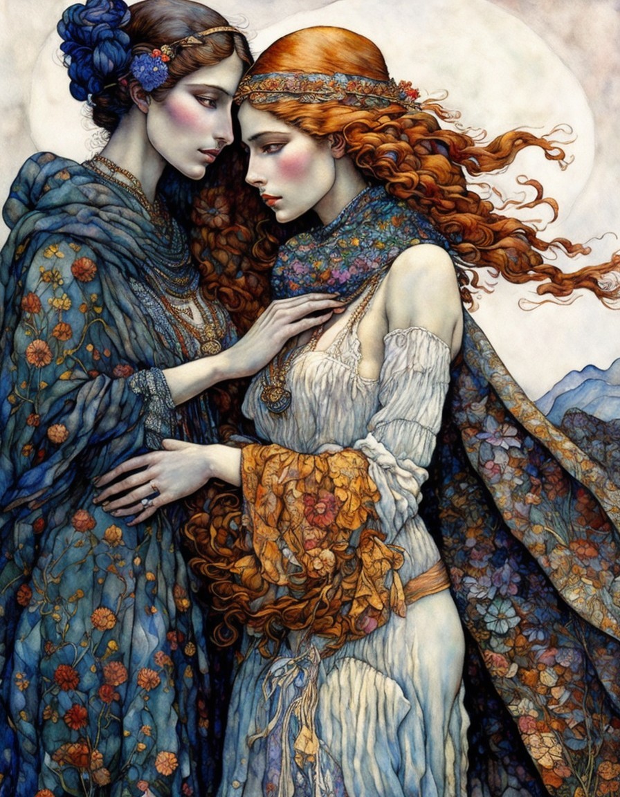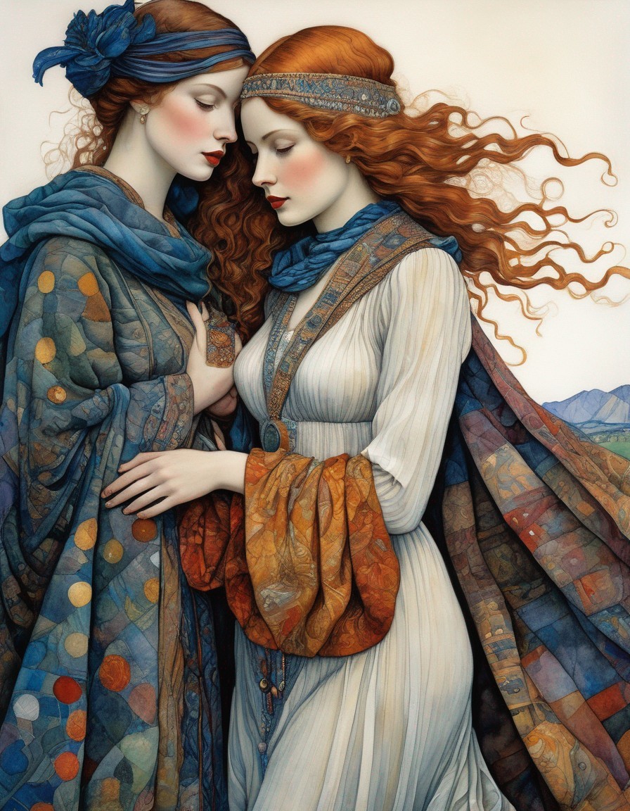 An ethereal illustration of a woman with flowing hair amidst vibrant blue and orange flowers, wearing a wide-brimmed hat and white dress.