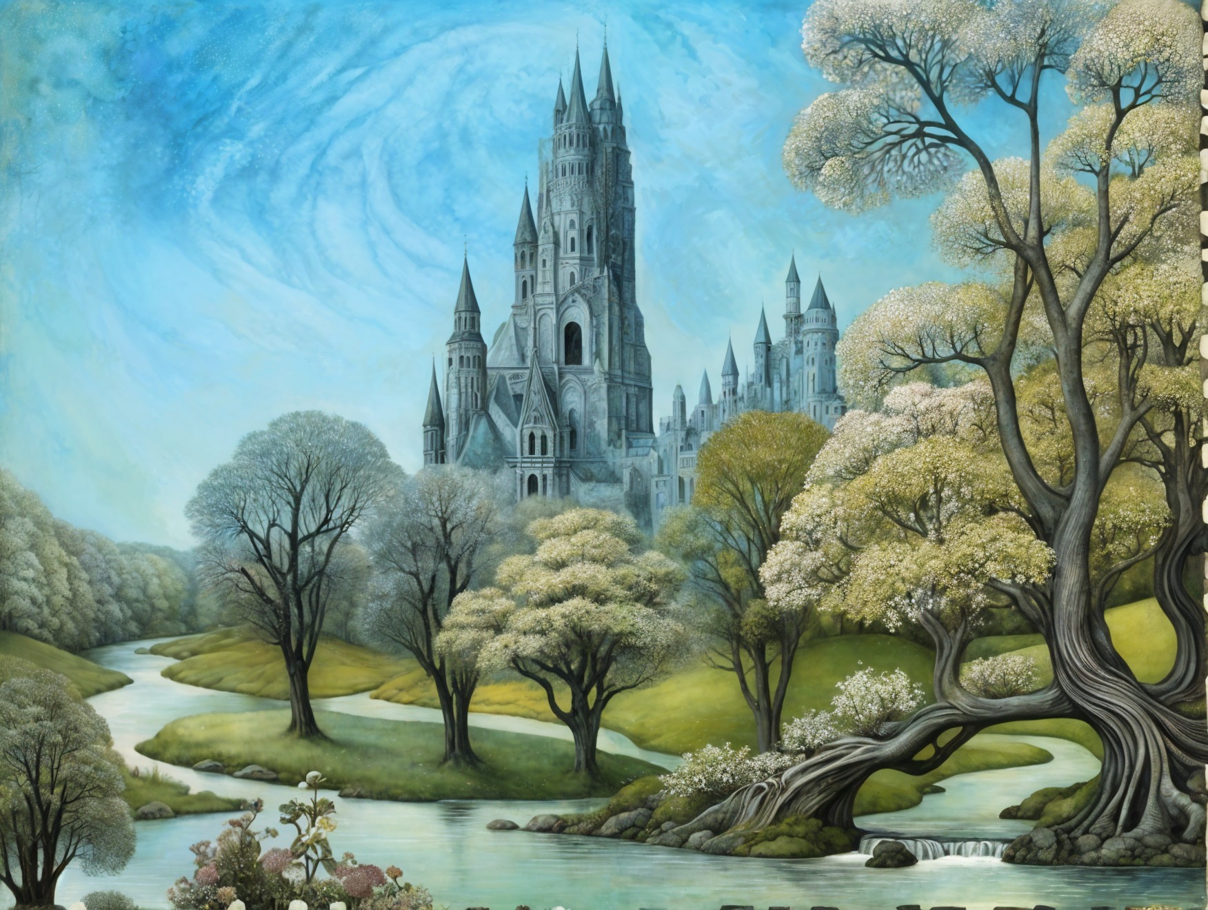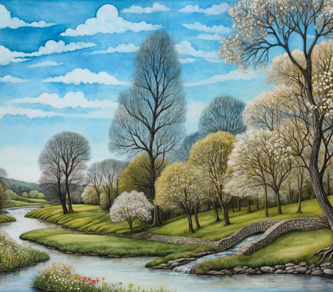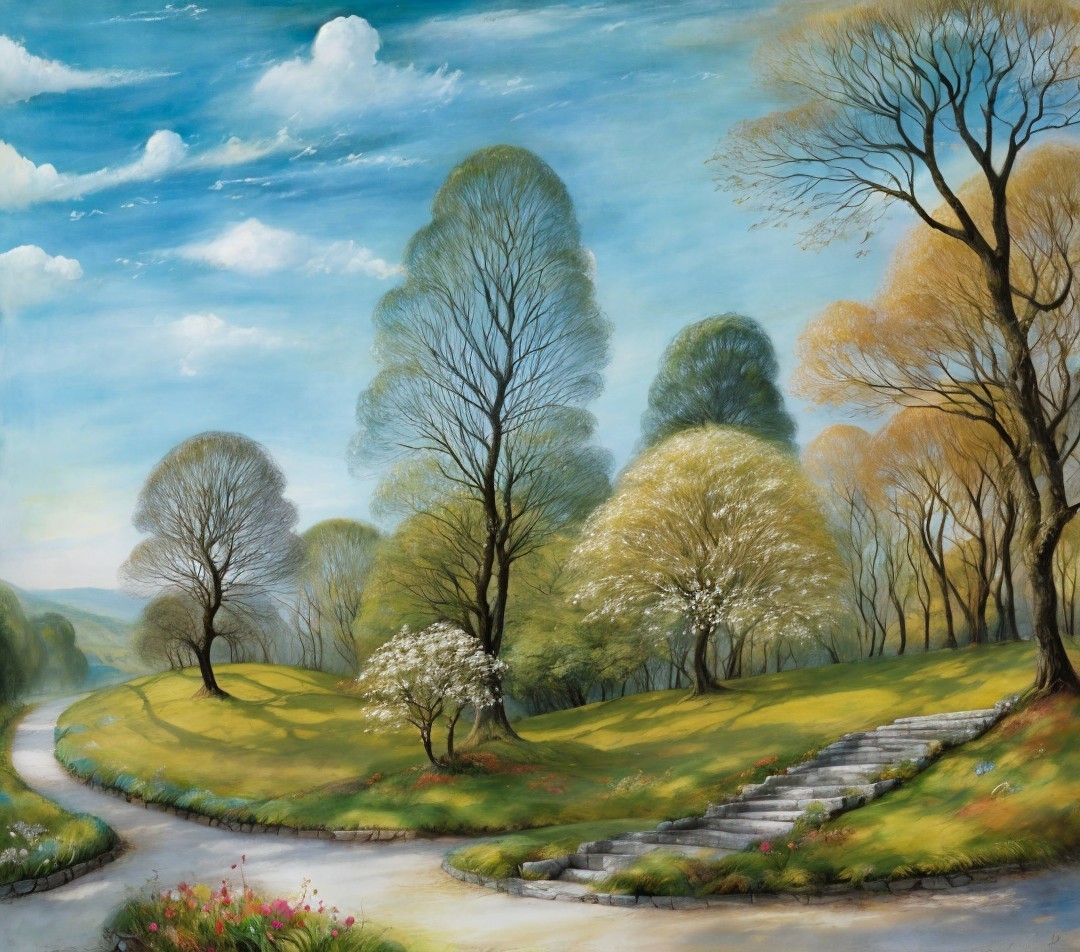 A serene landscape depicts a charming village with quaint houses, lush trees, and a blooming white tree. Two couples enjoy a leisurely moment along a winding path under a bright sky.