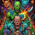 A vivid, chaotic illustration featuring grotesque, colorful monsters with multiple eyes and mouths, intertwined with mechanical elements, set against a cosmic background of vibrant colors and flames.
