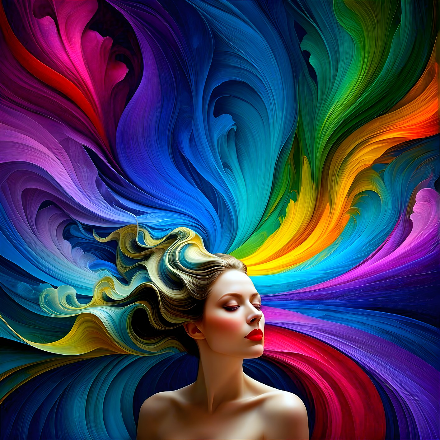 A vibrant blend of swirling colors radiates from a woman's head, creating a dynamic backdrop. Her serene expression contrasts with the energetic hues, embodying creativity and expression.