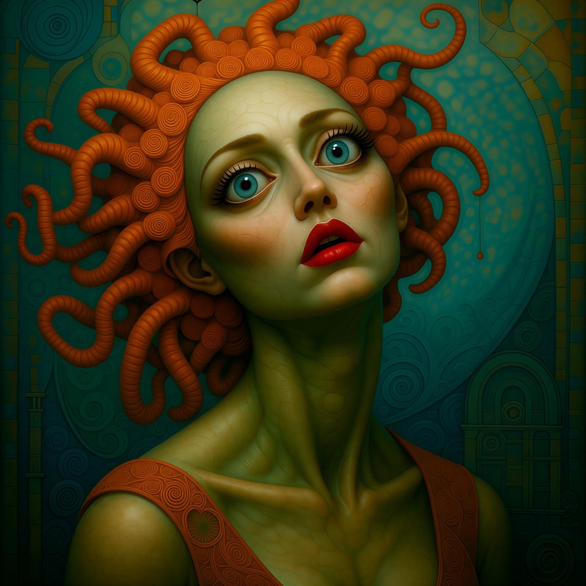 A close-up portrait, 4k digital art, intricate, Medusa. She has bright blue eyes and shiny red textured lips. She has multiple round squiggly orange elements for hair. The background consists of teal and blue with squiggly elements. Her skin is pale yellow. Original Prompt: