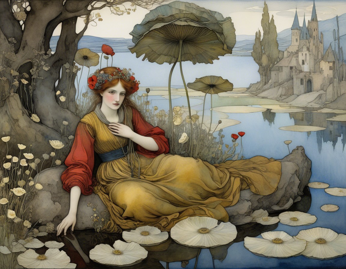 A serene woman in a colorful gown sits in a boat, holding an umbrella amidst blooming flowers. In the background, a tranquil landscape features distant castles and a calm lake.
