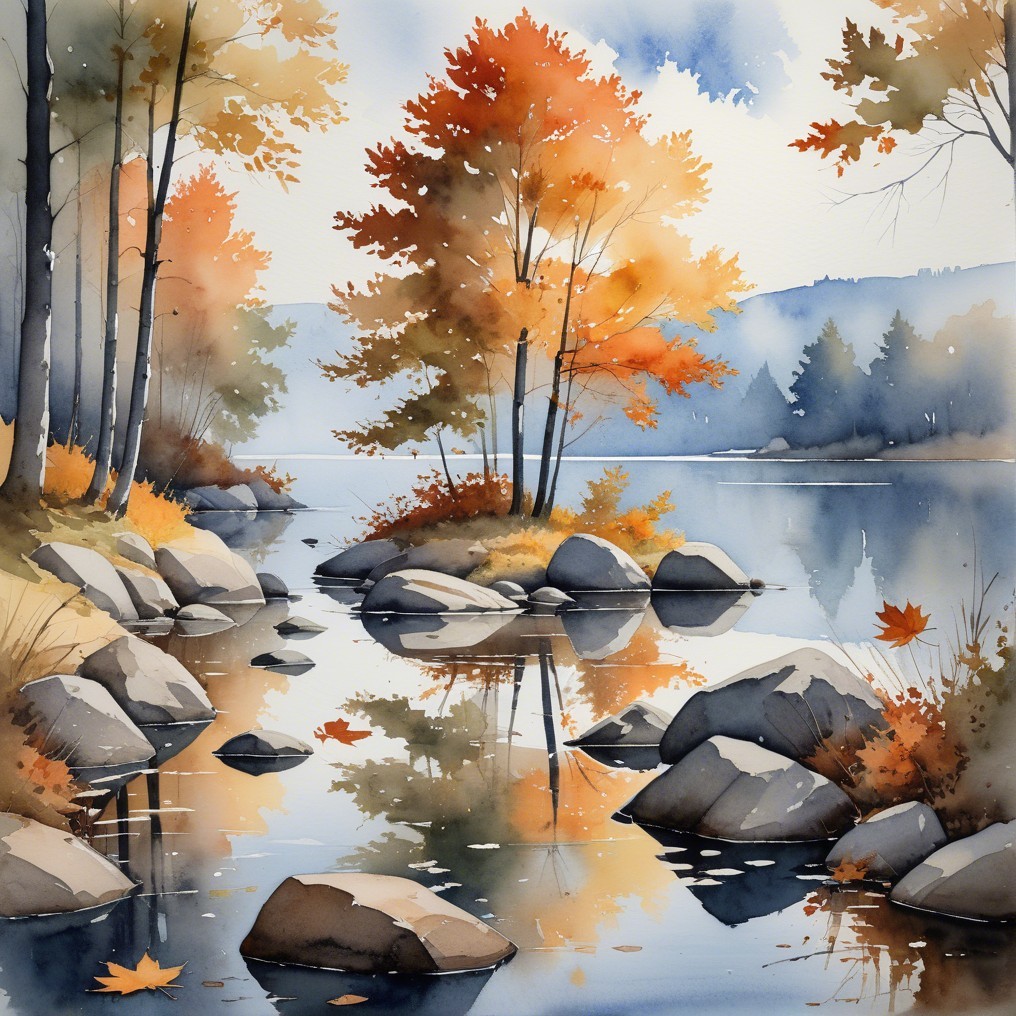 A tranquil autumn watercolor scene with a lake, colorful foliage, and rocks reflecting on calm waters.