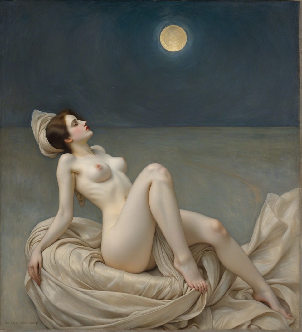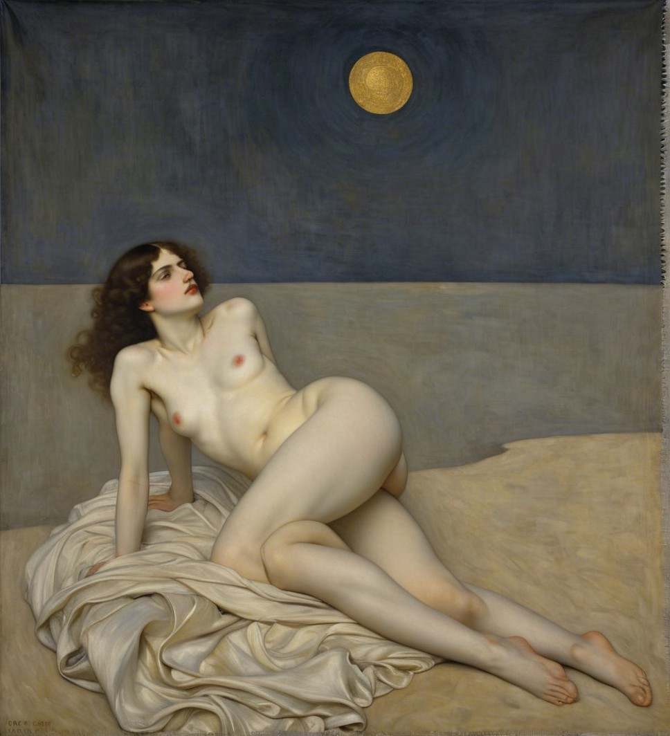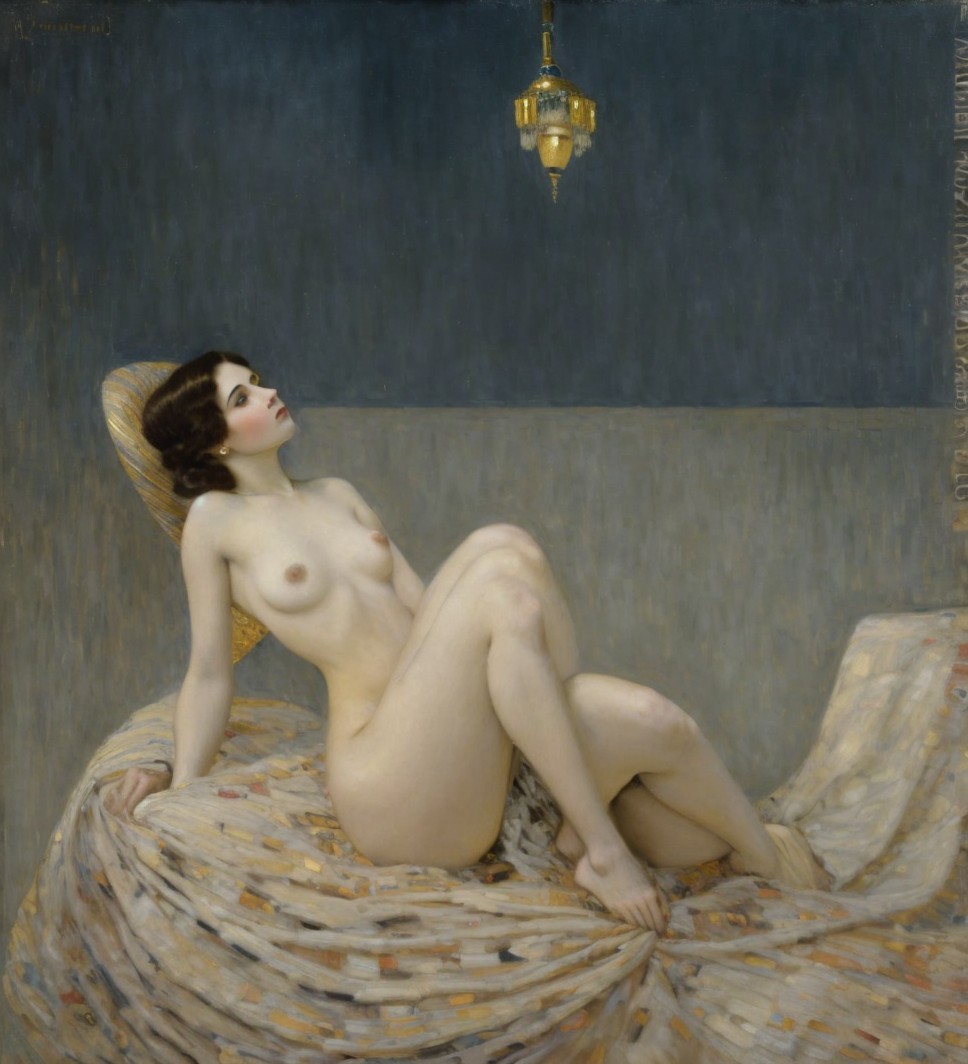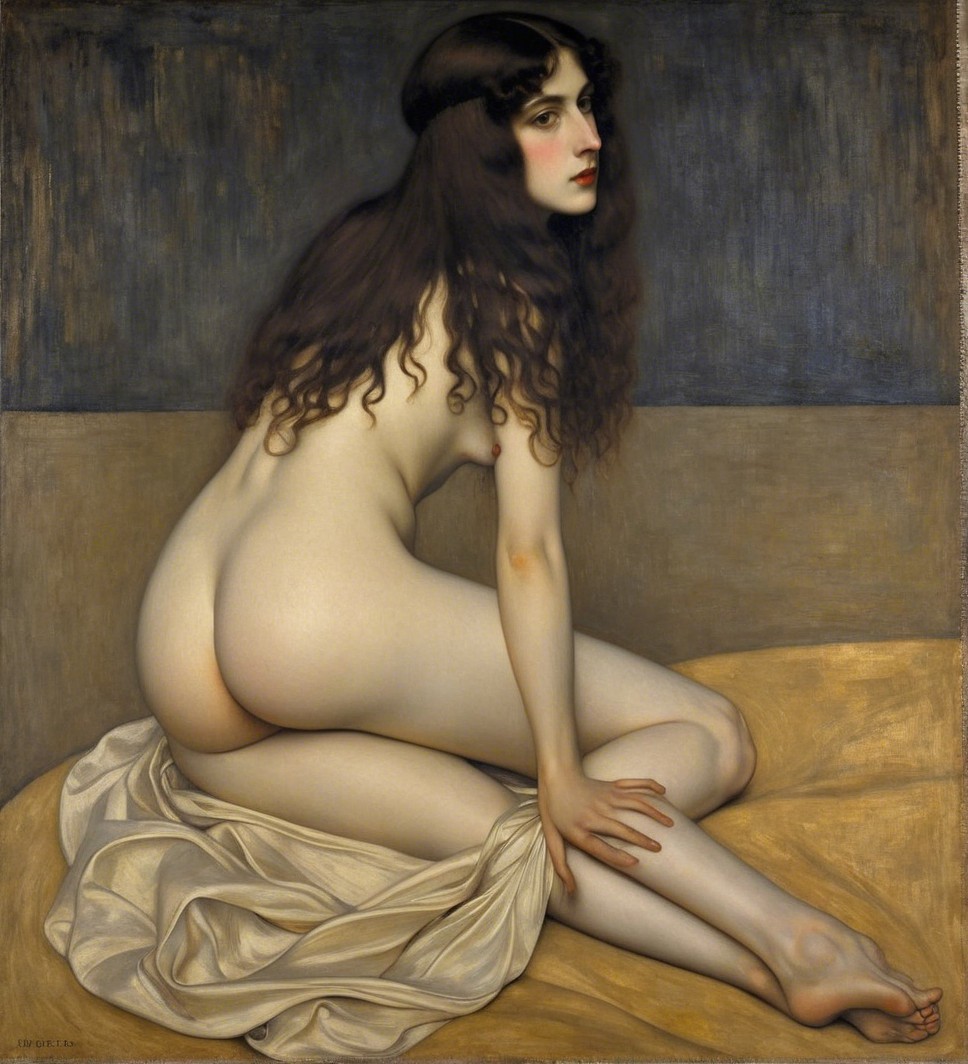 The artwork depicts a young woman with long, flowing hair, seated gracefully. She is partially draped in a golden shawl, exuding a sense of elegance and introspection against a muted background.