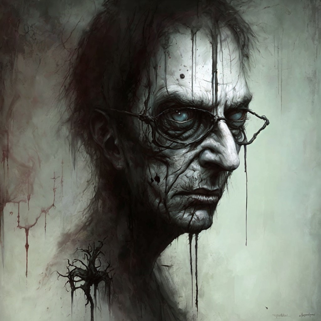 Hyperrealistic grayscale portrait of intense bespectacled man with dripping paint effect.