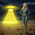 A futuristic scene on a beach features a stylish figure in a silver jumpsuit standing beside a glowing UFO, with a nighttime sky and ocean waves in the background.