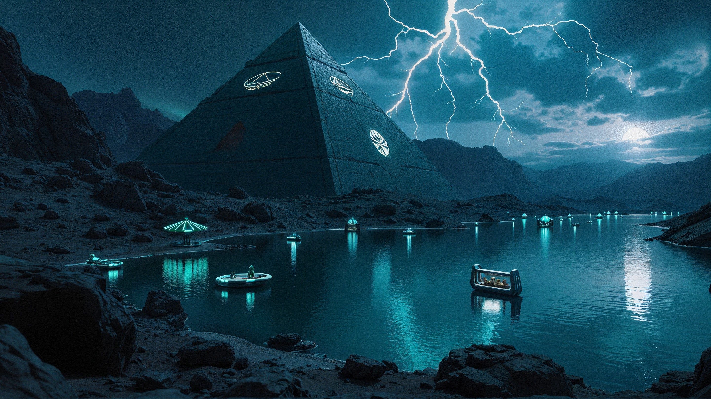 A breathtaking vista of a futuristic ziggurat on Mars, its colossal, gleaming obsidian structure reflecting the emerald glow of a nearby Martian lake. Miniature models of Earth's ancient ziggurats are scattered at its base, showcasing a poignant juxtaposition of past and future.