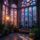 The image features a stunning interior with tall stained glass windows, casting vibrant colorful light across the floor, which reflects a mix of hues, amid lush greenery in pots.