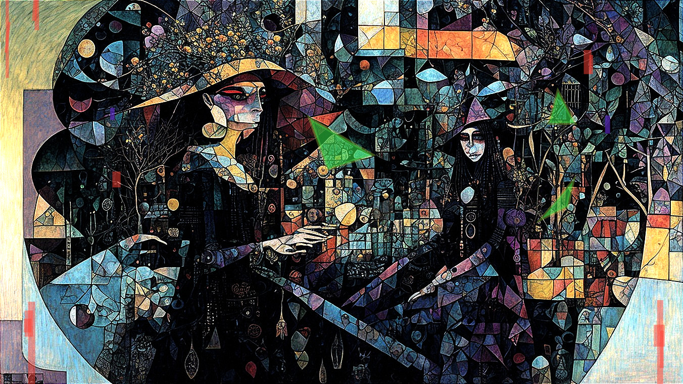 The artwork features two figures in dark, elaborate attire, surrounded by a vibrant blend of geometric shapes and natural elements, evoking a mysterious and surreal atmosphere.