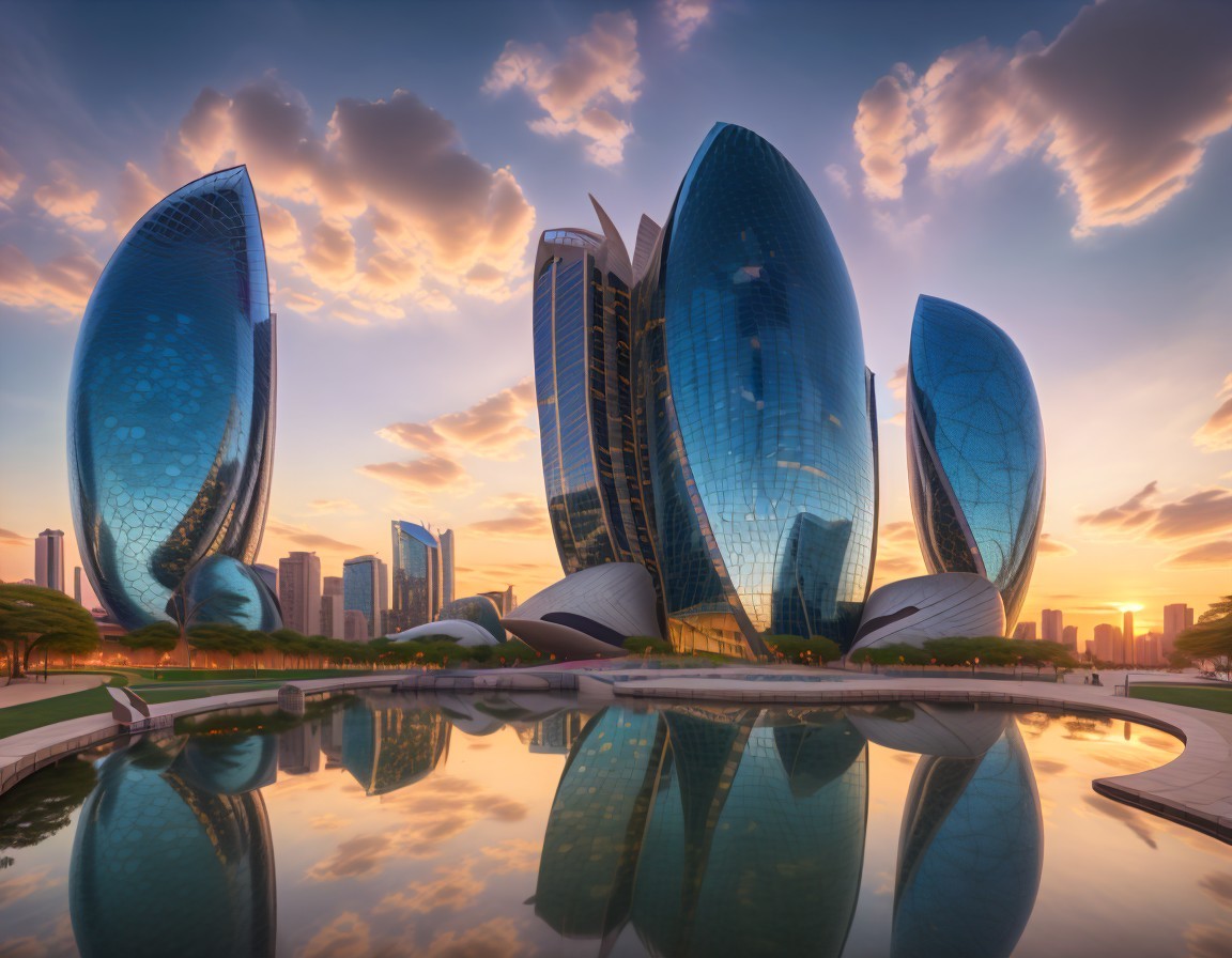 Modern skyscrapers with reflective glass facades against a sunset sky, mirrored on a calm water surface in an urban setting.