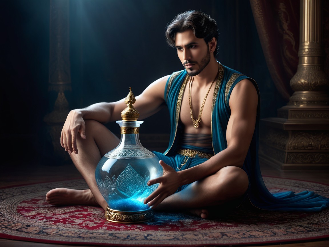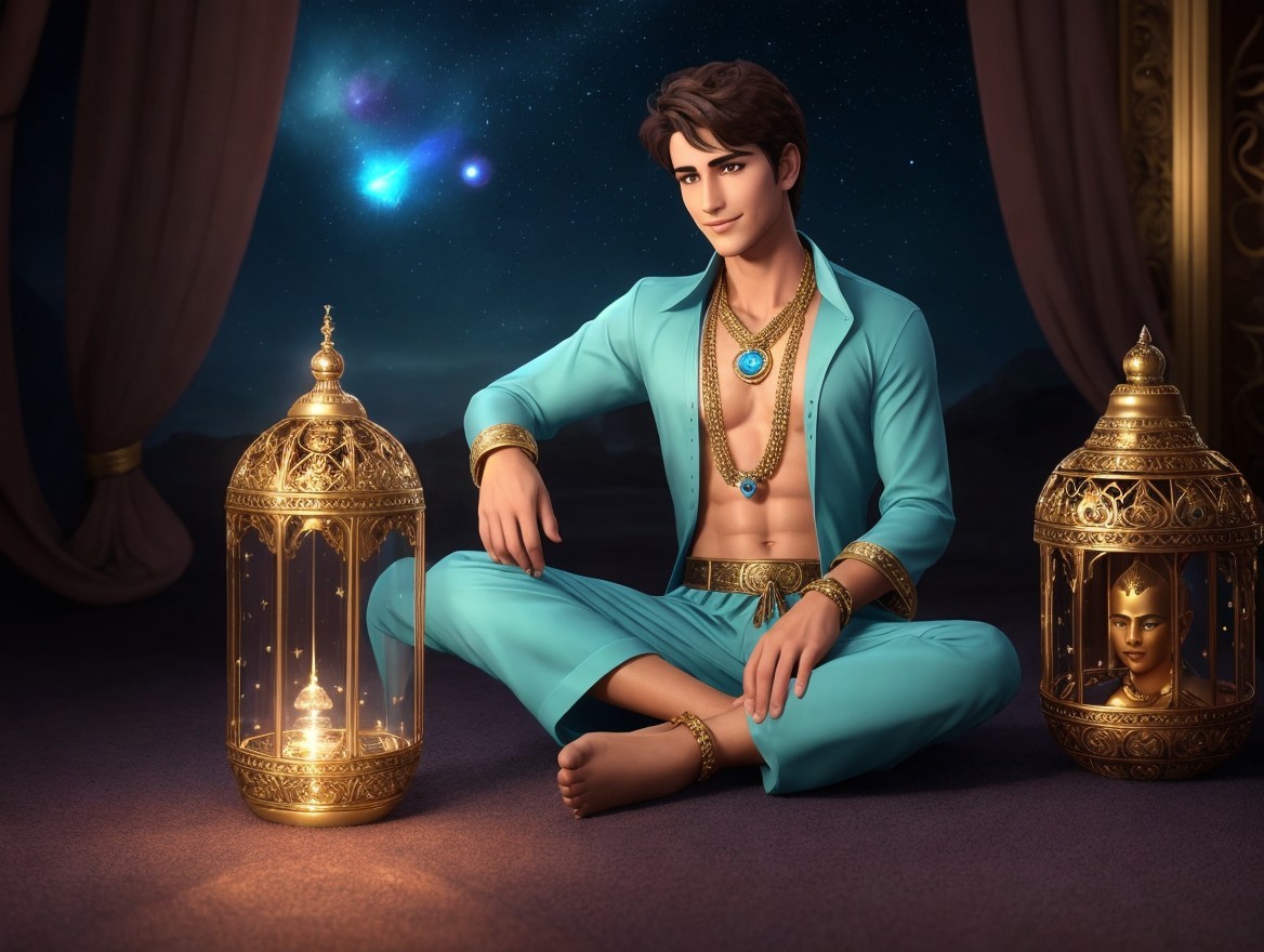 A young man in teal attire sits cross-legged, holding a glowing lantern with swirling light inside. The dimly lit background features elegant drapes and candles, creating a magical atmosphere.