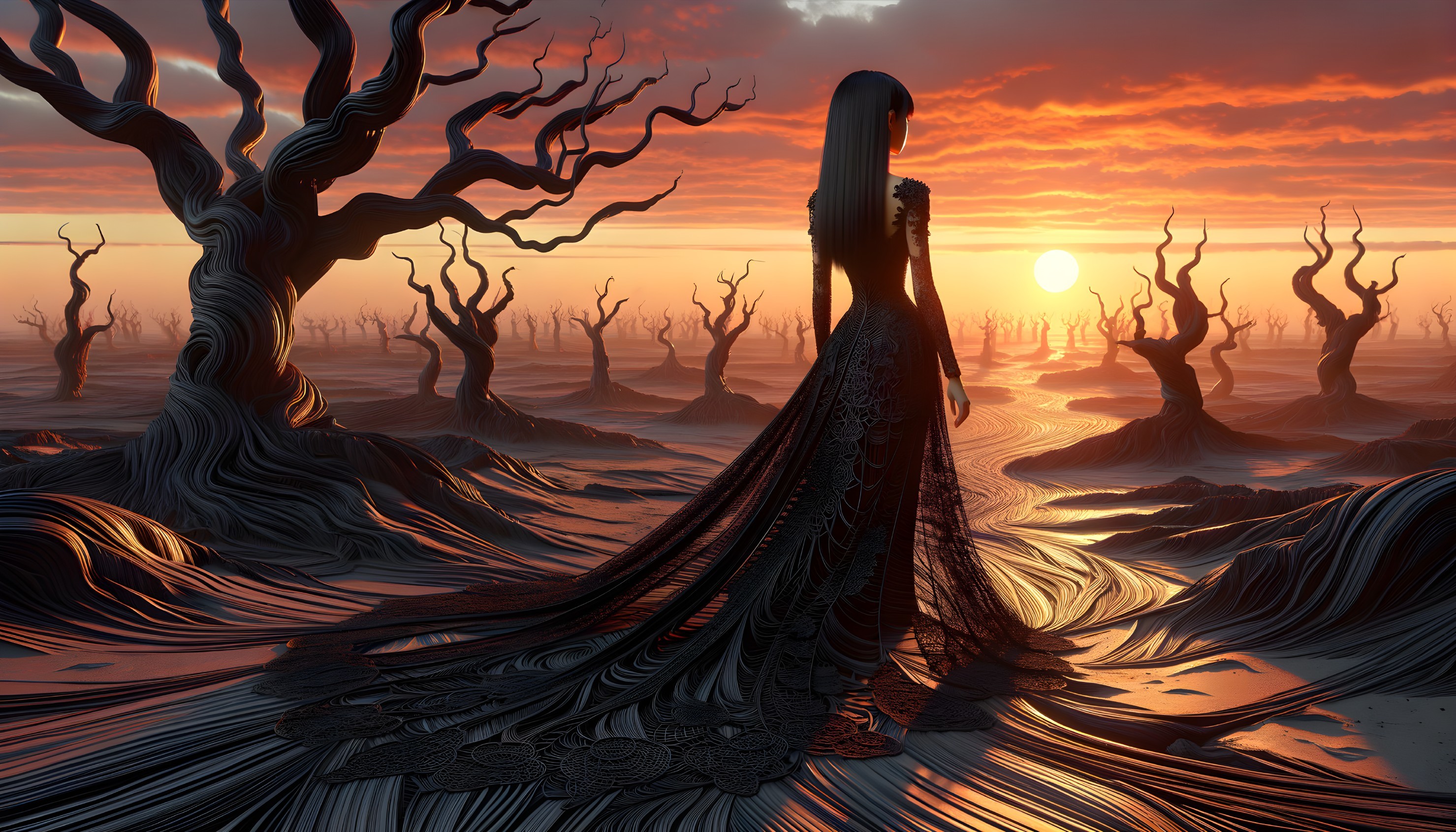 A woman in an elaborate gown stands in a surreal, barren landscape with twisted trees, gazing at a dramatic sunset.