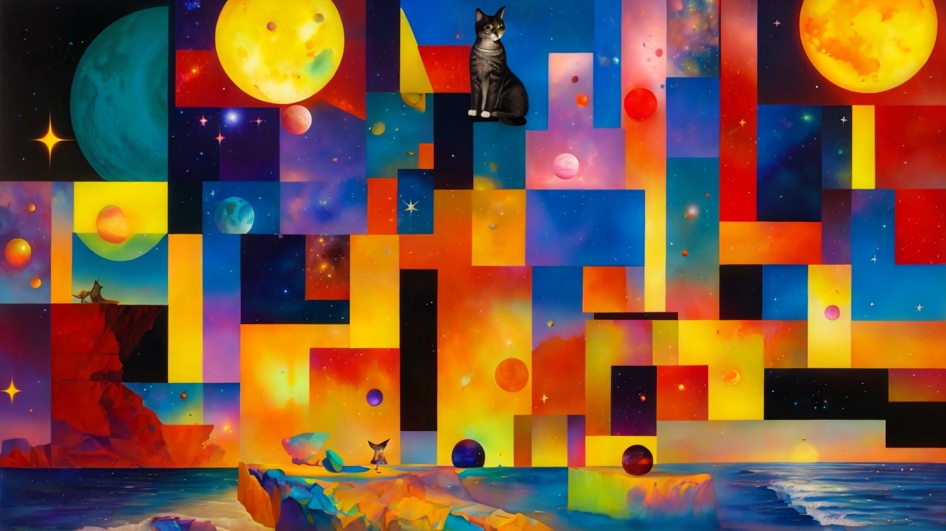 A vibrant abstract mural features a cosmic scene with bold colors, celestial bodies, and geometric shapes. A silhouette of a cat sits on a rock, gazing at the vivid, starry landscape.