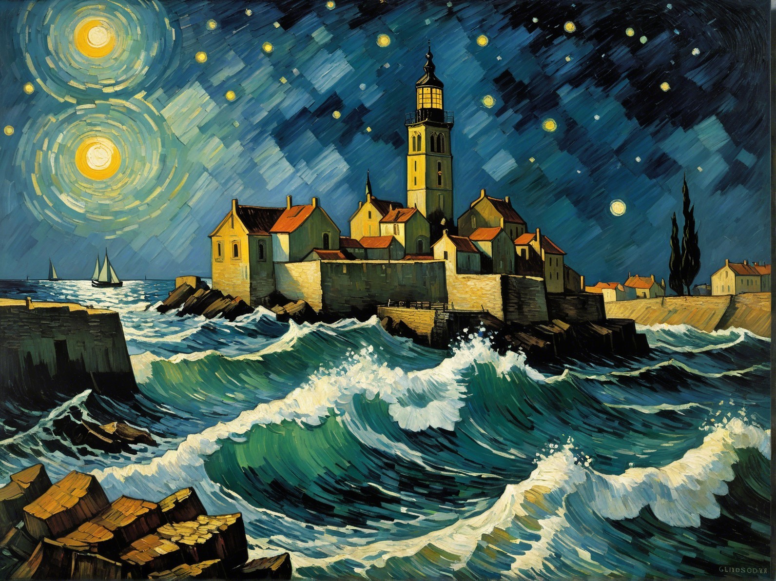 A lighthouse atop a rocky shore, illuminated by bright stars and swirling skies in the style of van Gogh. Turbulent waves crash against the rocks, evoking a sense of drama and beauty.