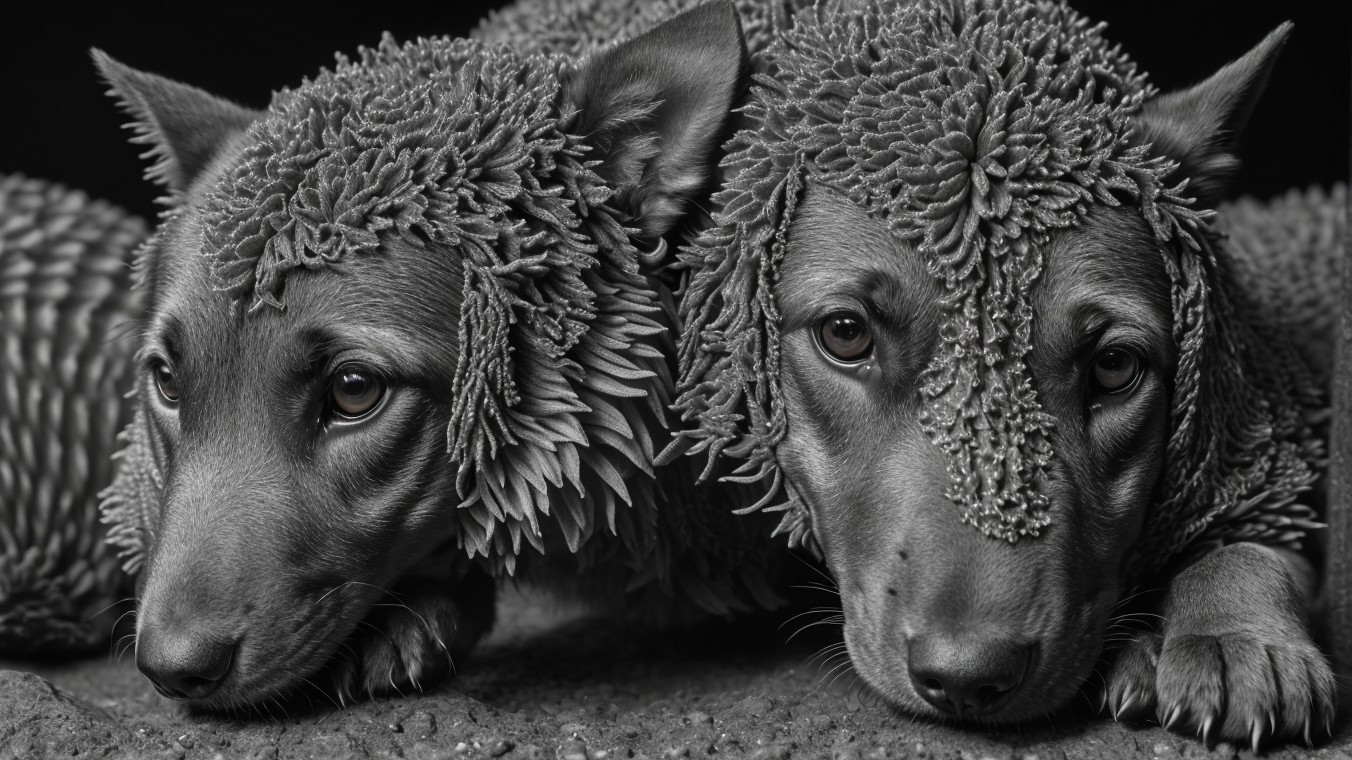 The image features two intricately designed creatures resembling animals, with textured, pineapple or pinecone-like exteriors and leafy, spiky features, set against a natural backdrop in black and white.