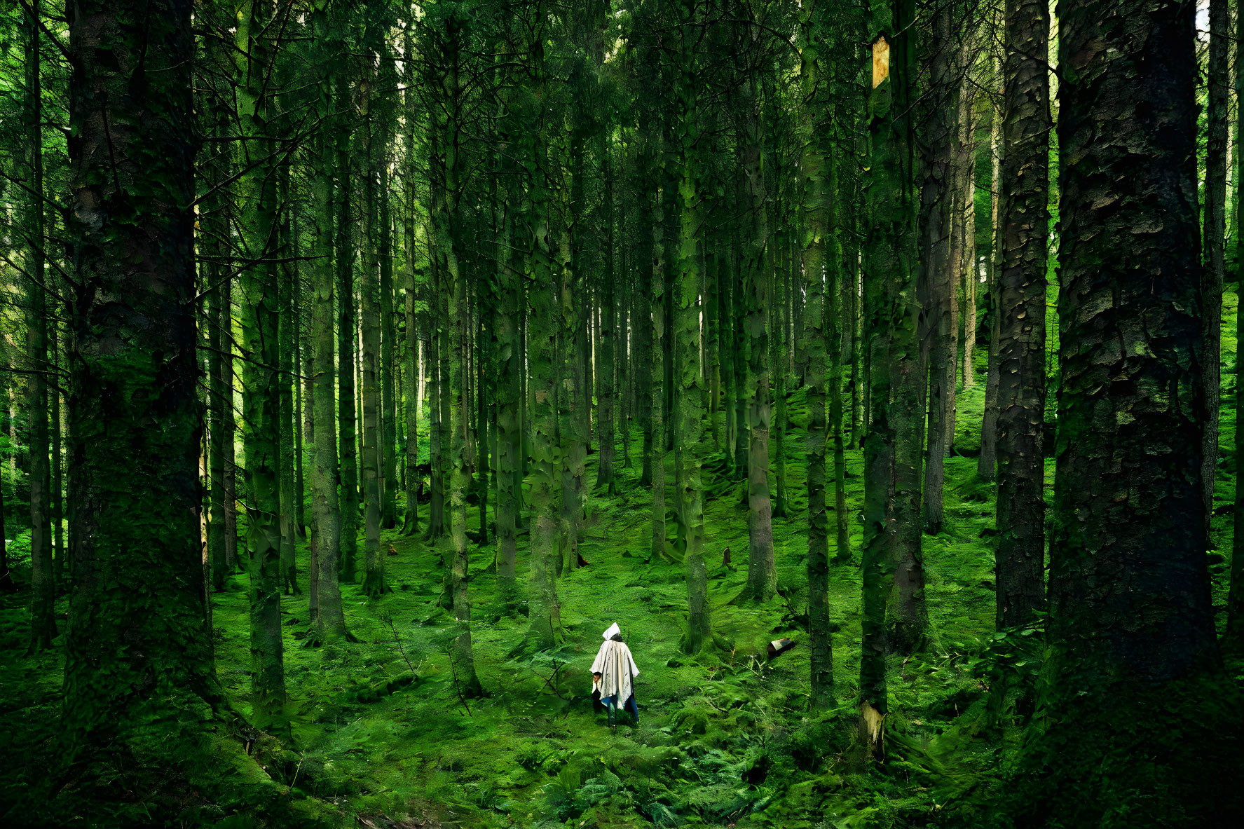 A vibrant, colorful forest with people walking under a rainbow canopy of leaves, reflected on a glossy surface with street lamps.