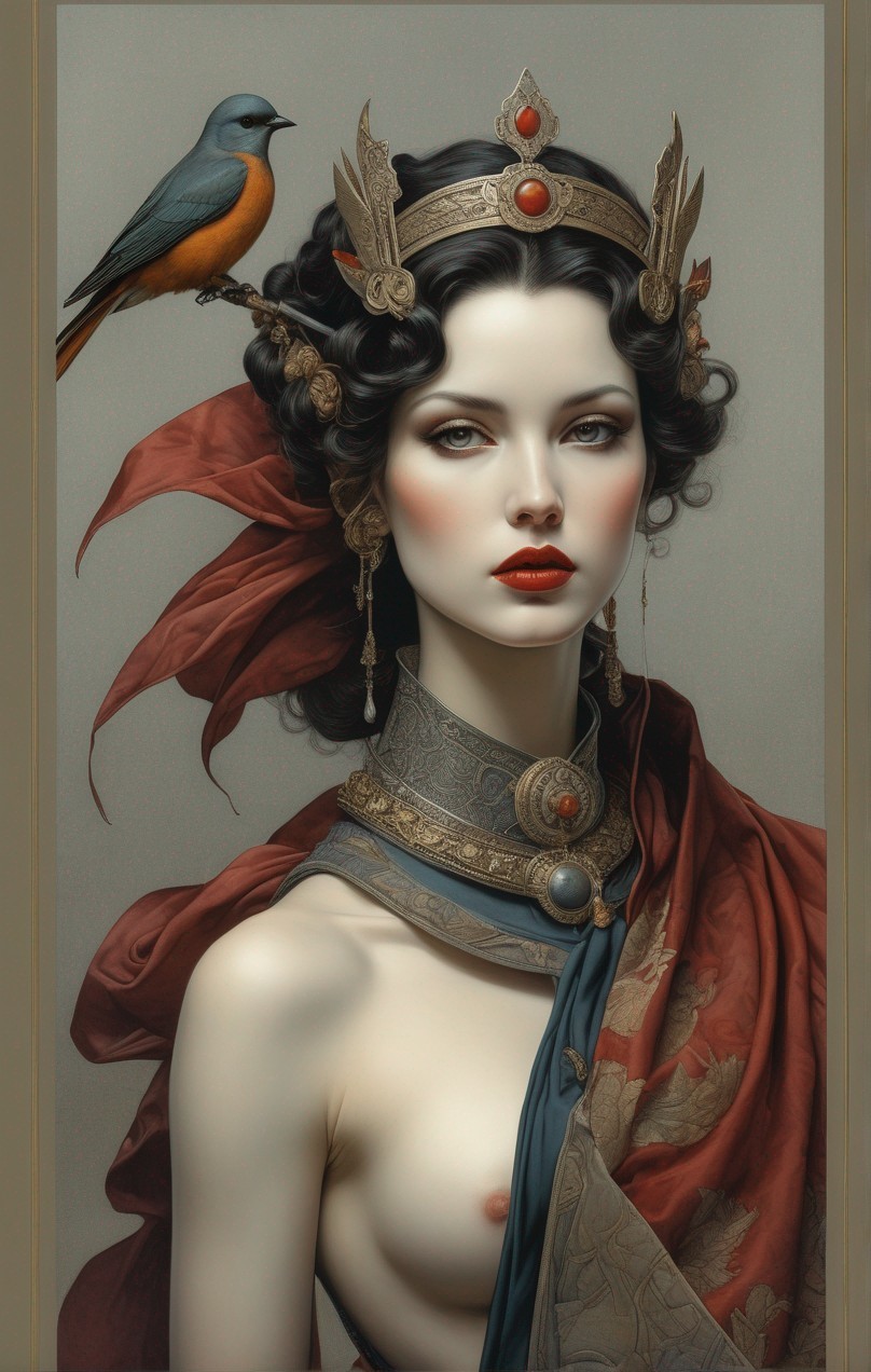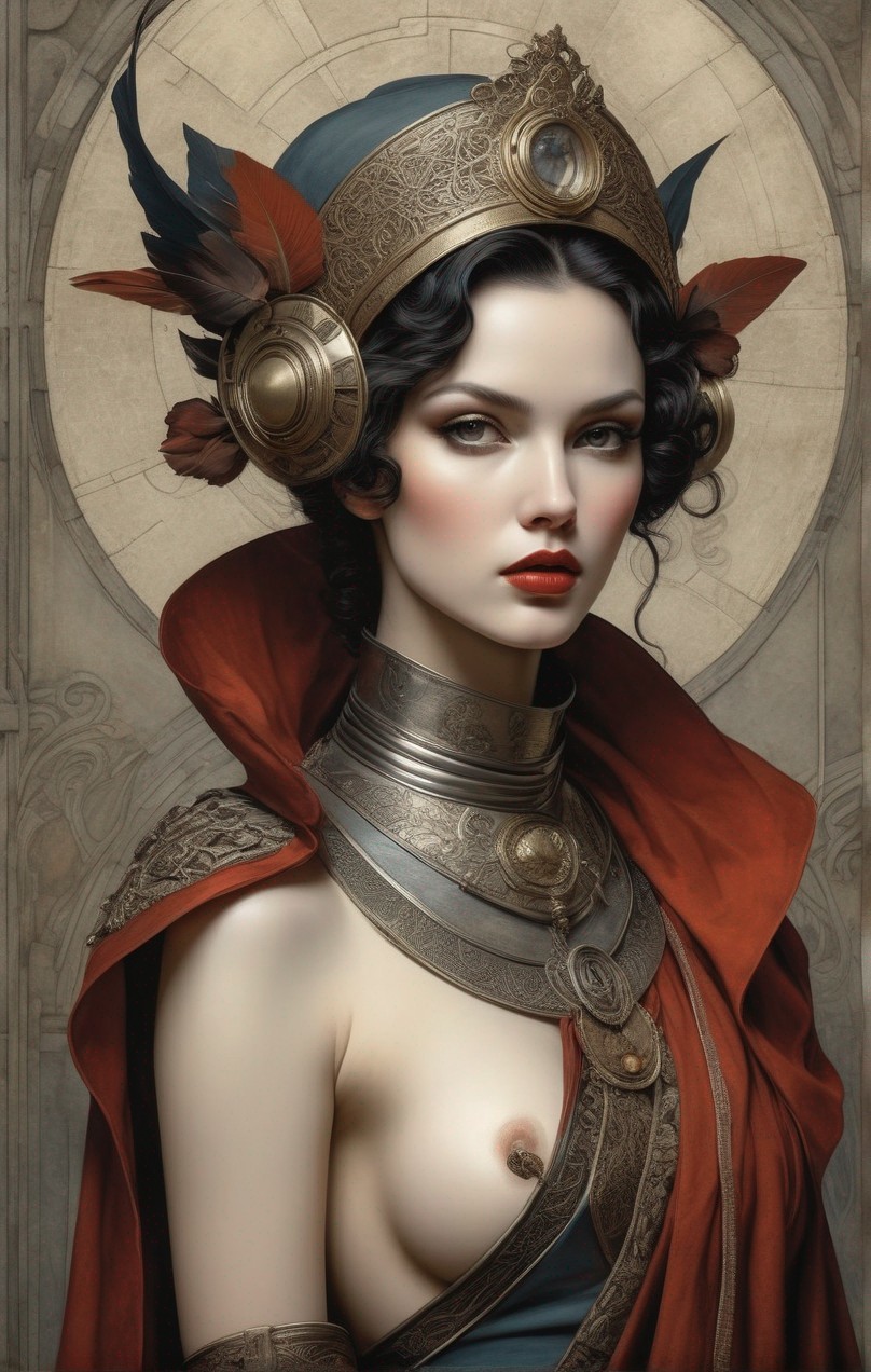 A woman in a stylized warrior costume with a winged helmet poses against a muted background, embodying a mythical or historical persona.