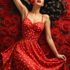 A woman in a red polka-dotted dress lies gracefully among vibrant red roses, her hair flowing around her. She holds a rose in her hair, exuding elegance and romantic charm.