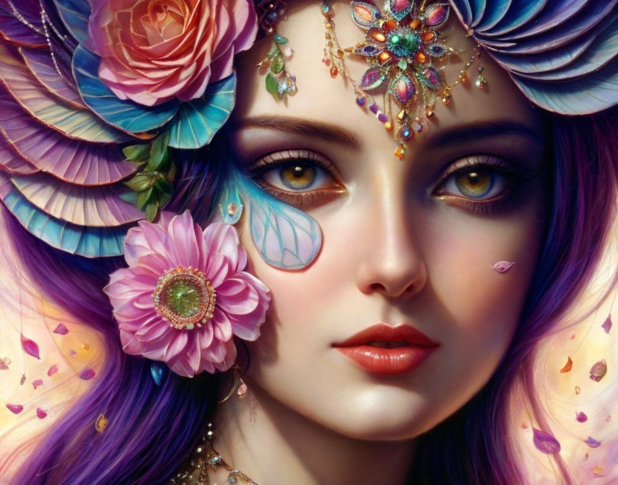 A portrait of a woman with vibrant flowers and feathers in her hair, showcasing intricate details and rich colors.