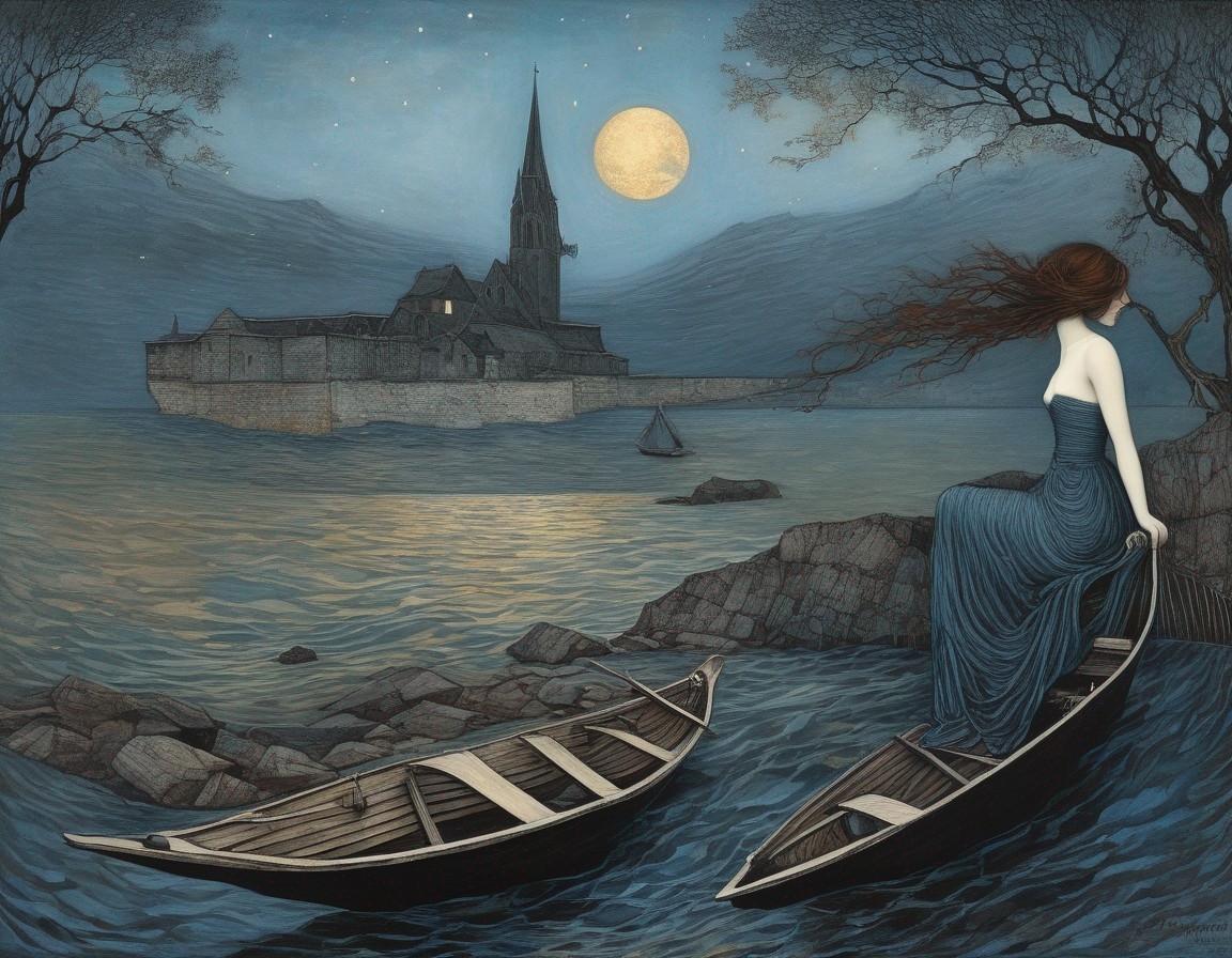 A woman with flowing red hair sits pensively on a rocky shore at night, watching sailboats under a large full moon.