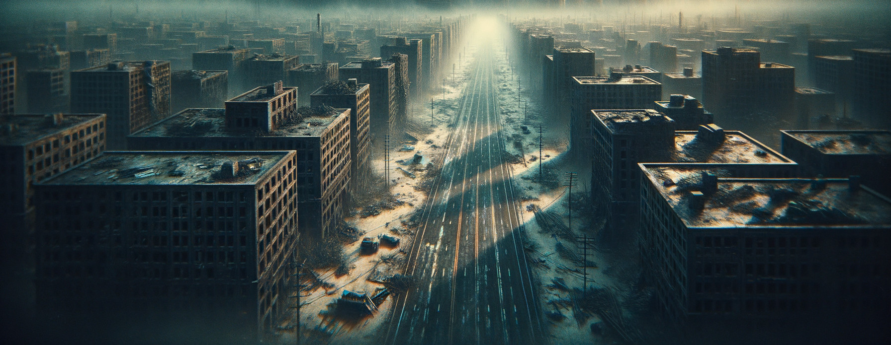 Explore a breathtaking post-apocalyptic cityscape with desolate streets, abandoned buildings, and a haunting atmosphere. The digital art features dramatic lighting, ominous shadows, and a retro VHS filter, creating a dark and immersive experience.