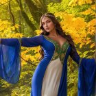 A serene fairy-tale scene features a captivating woman with striking green eyes and intricate jewelry, set against a lush, enchanted forest bathed in golden light. Magic and beauty abound.