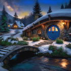 A cozy, snow-covered cottage with a bright blue door overlooks a serene stream. Surrounded by tall pine trees and twinkling lights, the night sky is illuminated by stars and the Milky Way.