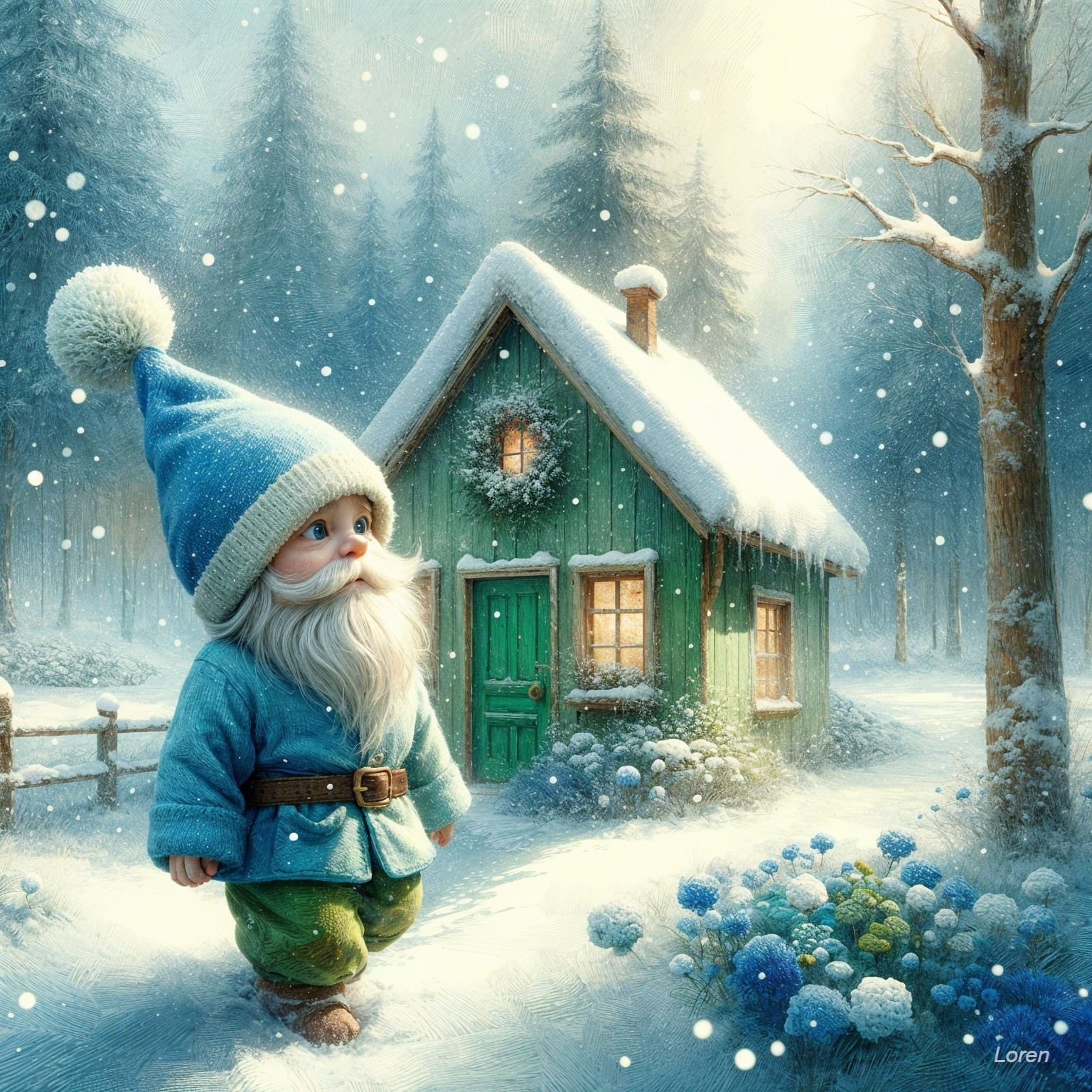 A cheerful gnome with a blue hat and white beard strolls through a snowy forest, approaching a cozy green cottage adorned with a wreath, surrounded by snowflakes and blue flowers.