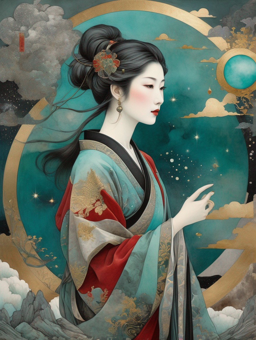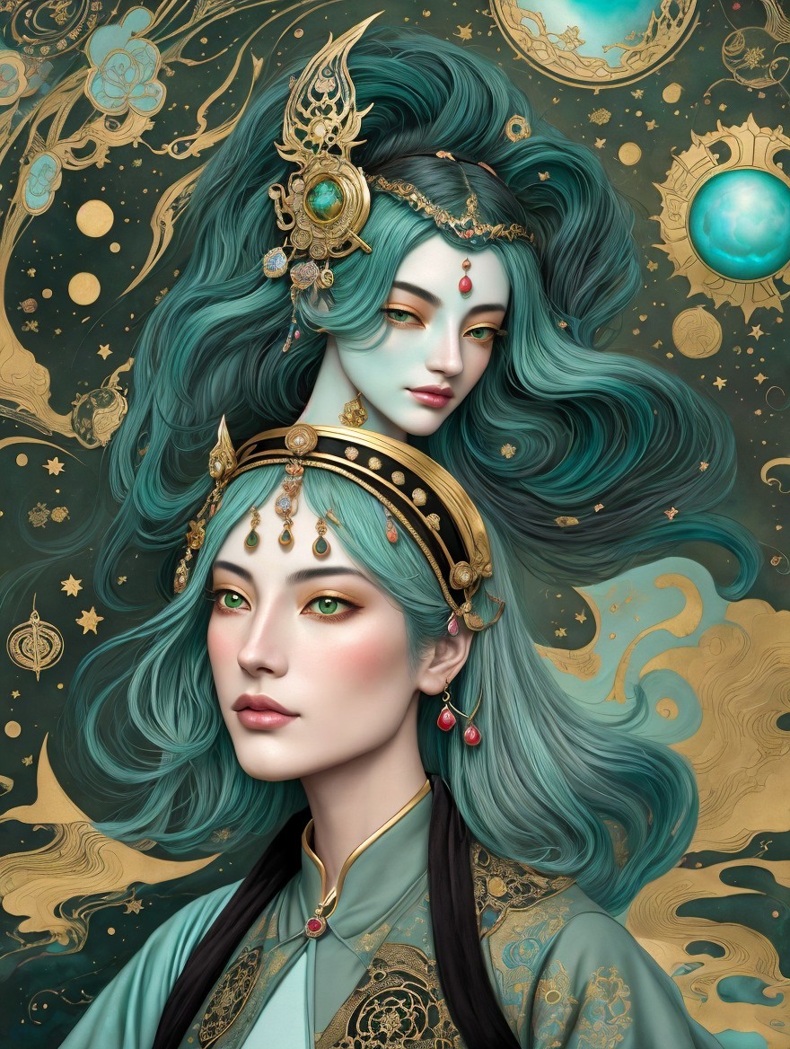Beautiful androgynous person in a surreal celestial landscape,, Medieval Japanese Artists Sumi-e Style. 3rd century Persian miniature art. Turquoise , grey-green, Ruby red, Velvet Black, Shabby, Dull Gold, Amber Gray, Golden Ratio, Surreal Fantasy, Elegant, High Definition Ultra Fine 3D Line, Zenangle Style, Watercolor Patchwork , Arthur Rackham Style, Paul Kidby, , Jacek yerka, Extremely Detailed, Intricate, Thoughtful, HDR, Fractal, Beautiful, Award Winning, Fantasy Look, Fantasy, Crisp Quality