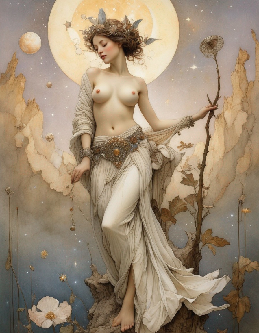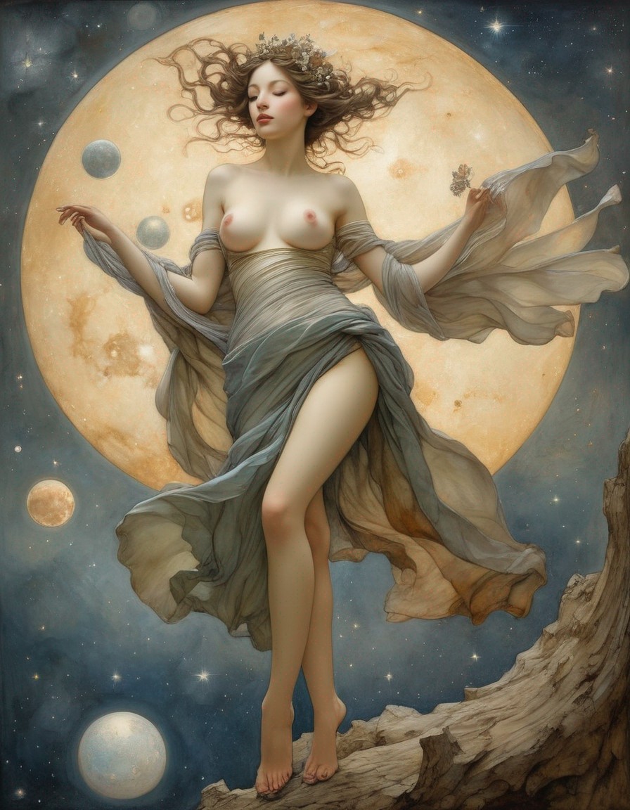 A surreal artwork depicts a woman with flowing hair and drapery against a lunar backdrop with a celestial motif.