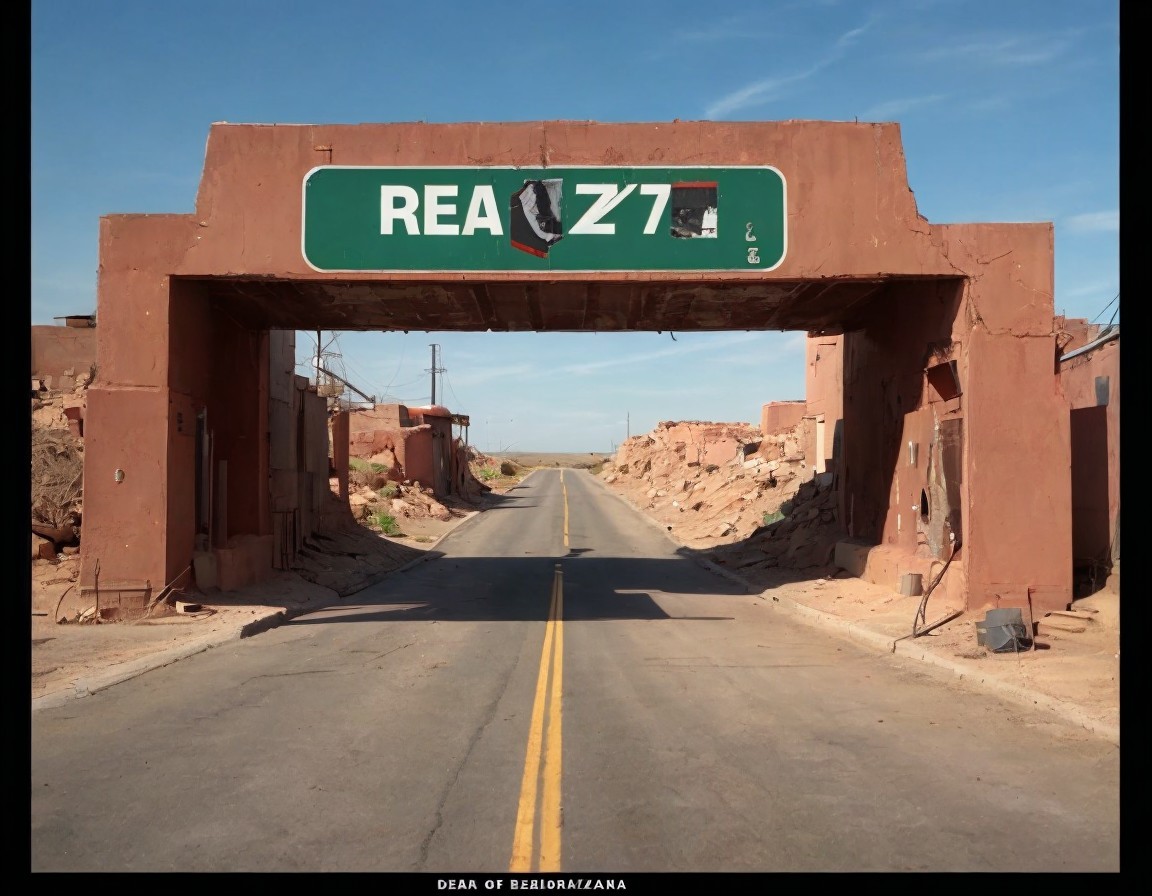 A snowy village entry arch with "KIEDYZ4" text over a clear road, flanked by cozy houses and a car under a winter sky.