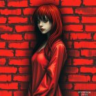 A stylish figure stands against a bright red brick wall, wearing sunglasses and a vibrant red top. Her long hair flows down, adding to the bold color contrast in the scene.
