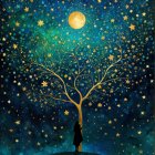 A vibrant, starry night scene features a glowing full moon and a decorated Christmas tree by a tranquil lake, reflecting the festive lights and surrounding cozy houses amidst tall trees.