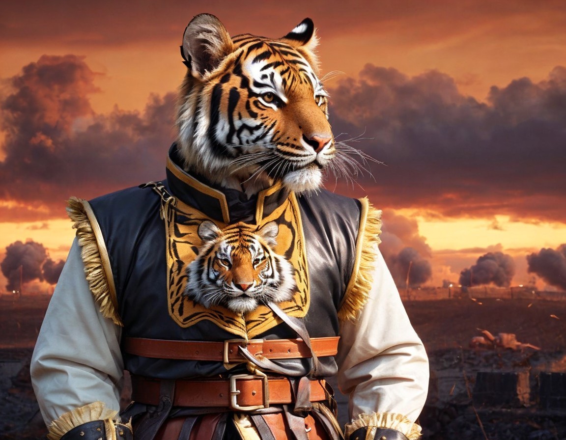 Digital artwork: humanoid tiger in military uniform on battlefield