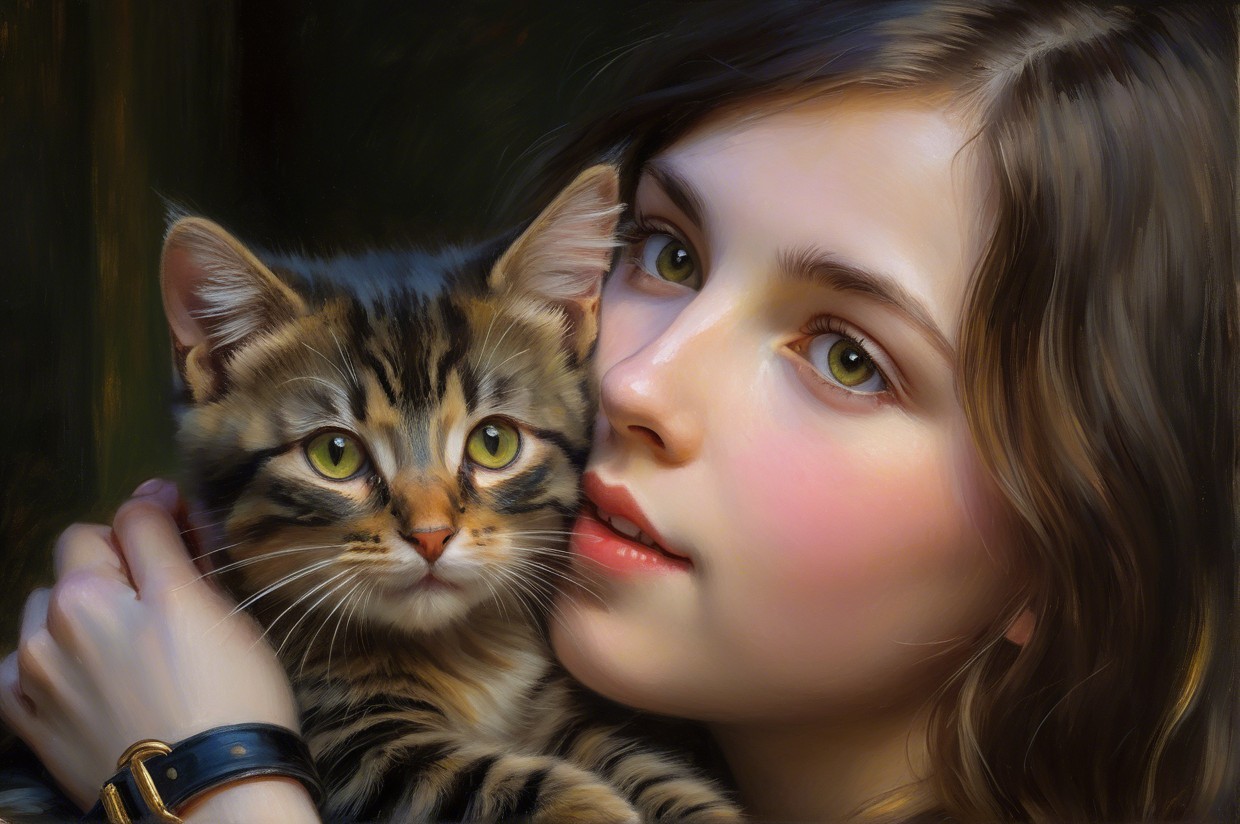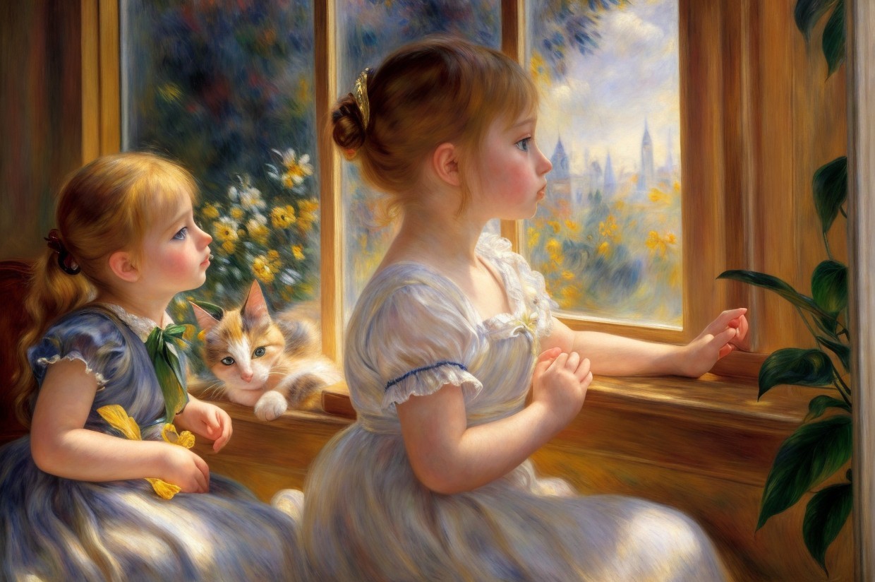 Two young girls sit by a sunlit window, one painting while the other gazes curiously. A playful white kitten adds charm to the serene scene, surrounded by a vibrant natural landscape.