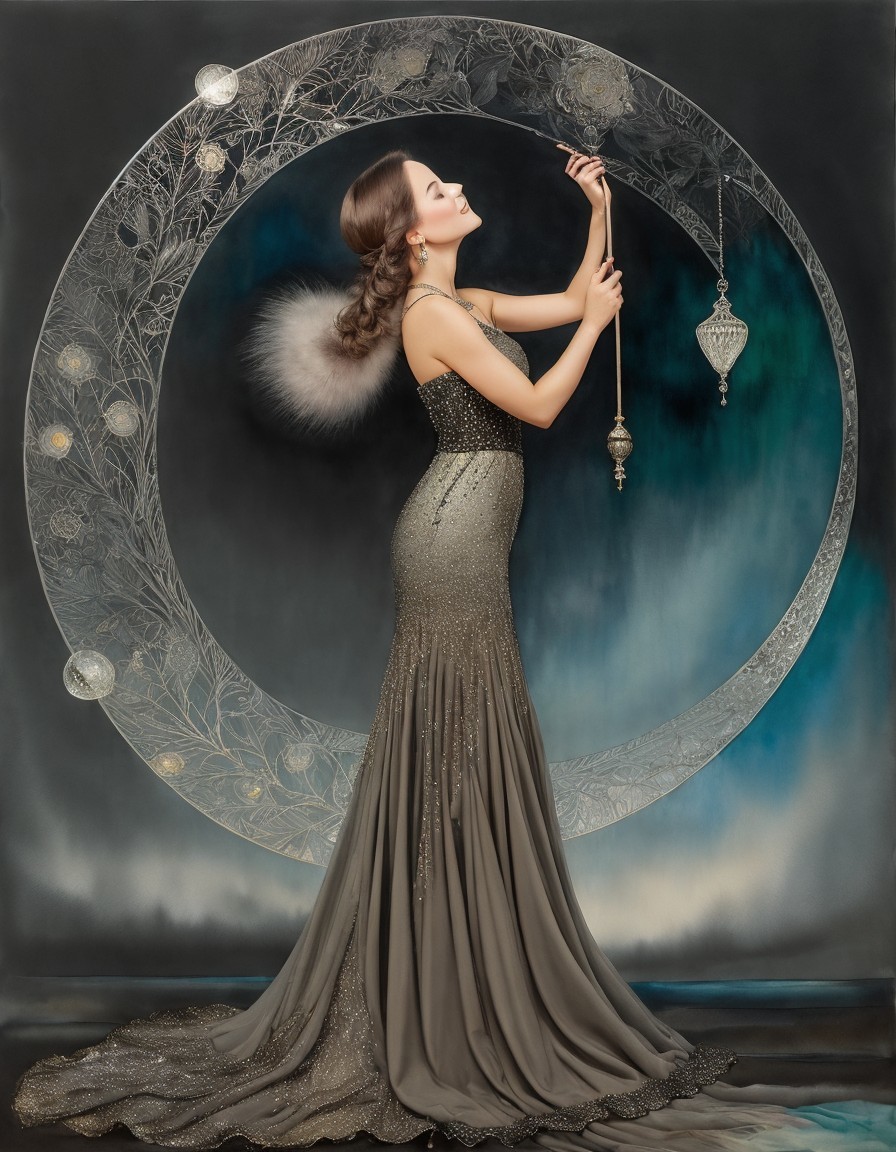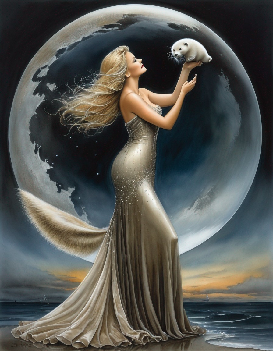 An illustrated woman in an elegant gold dress holds a fish, with a full moon and sea in the background.