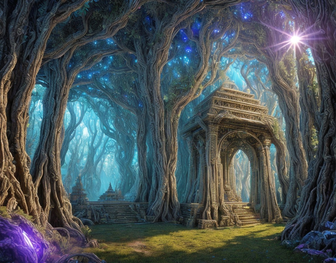 Highly detailed and intricate hypnotic interdimensional portal, optical illusion of incredible depth, high-tech alien temple, mysterious alien glyphs, ancient divine temple, advanced alien technology, Ultra-realistic forest surroundings, intricate geometric patterns, sacred geometry, bright light rays, sacred geometric shapes, DMT and Ayahuasca-inspired patterns, fractaling geometric shapes, surrealism, spirituality, psychedelic visionary art, psytrance artwork, shamanic DMT art, Cameron Gray inspiration, mystical ambiance, intricate digital art. Ultra-realistic landscape